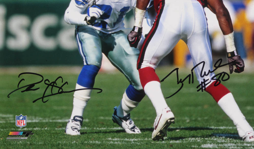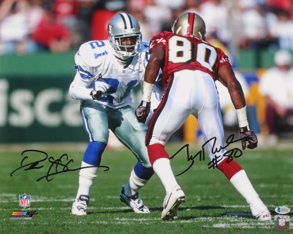 Photo measures 16" x 20" in size and has been hand-signed in black felt-tip pen by Deion Sanders (Dallas Cowboys, HOF) and Jerry Rice (San Francisco 49ers, HOF)
