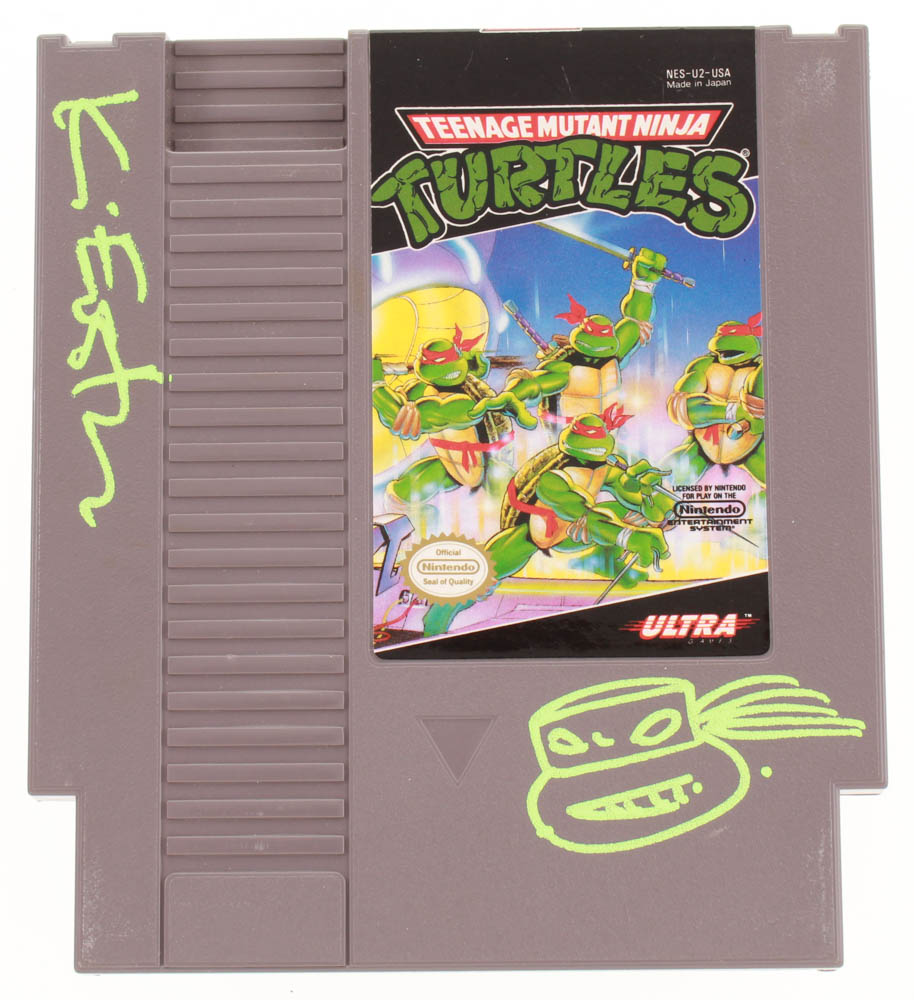 This original 1989 Teenage Mutant Ninja Turtles Nintendo video game cartridge is hand-signed in green paint pen, along with an original hand-drawn Turtles sketch, by the co-creator of the Teenage Mutant Ninja Turtles (TMNT), Kevin Eastman.