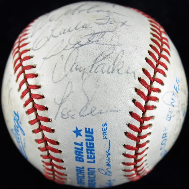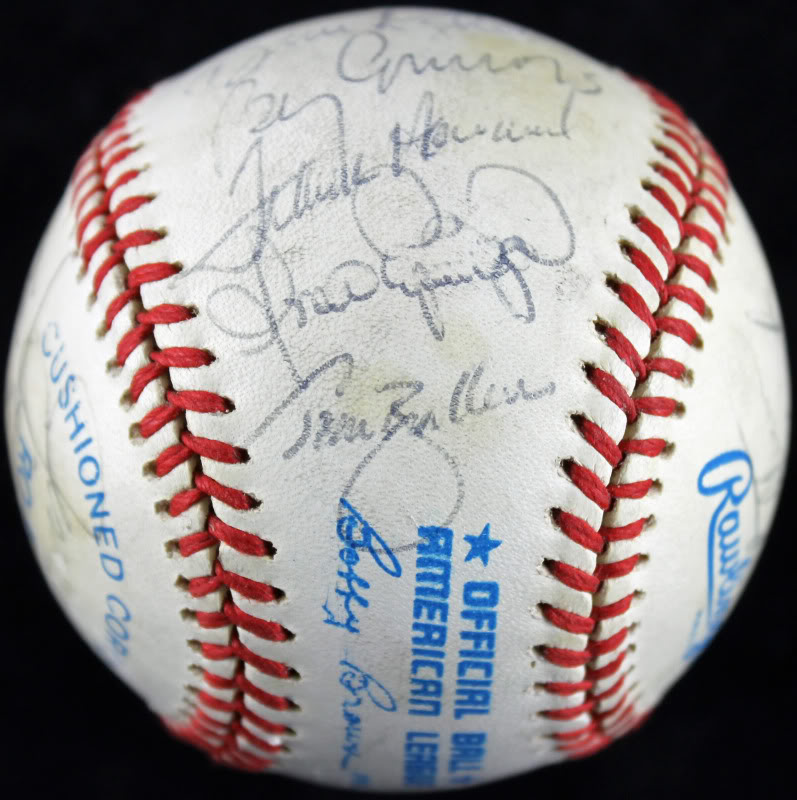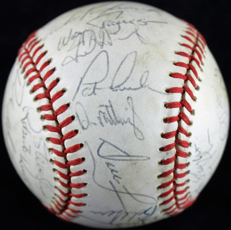 Rawlings Official American League baseball has been hand-signed in black and blue ink pen by (29) of the 1989 New York Yankees, with Rickey Henderson (HOF), Don Mattingly, Frank Howard, Steve Sax, Tommy John, Jesse Barfield, Dave Righetti, Pat Corrales, Bob Geren, Bob Brower, Clay Parker, Lee Elia, Ken Phelps, and (16) others. Please note, ball shows signs of natural toning. Please see images for details regarding the condition of the ball.