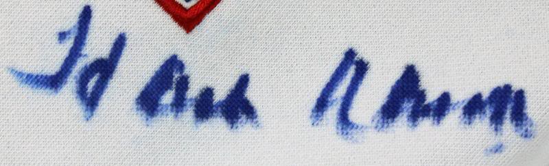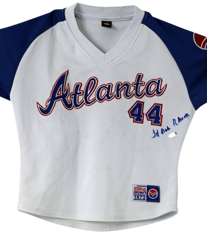 Soho Sports 1972 Atlanta Braves youth size jersey, everything is sewn on. Hand-signed in blue felt-tip pen by Hank Aaron (Atlanta Braves, HOF). Please see images for details regarding the condition of the jersey.