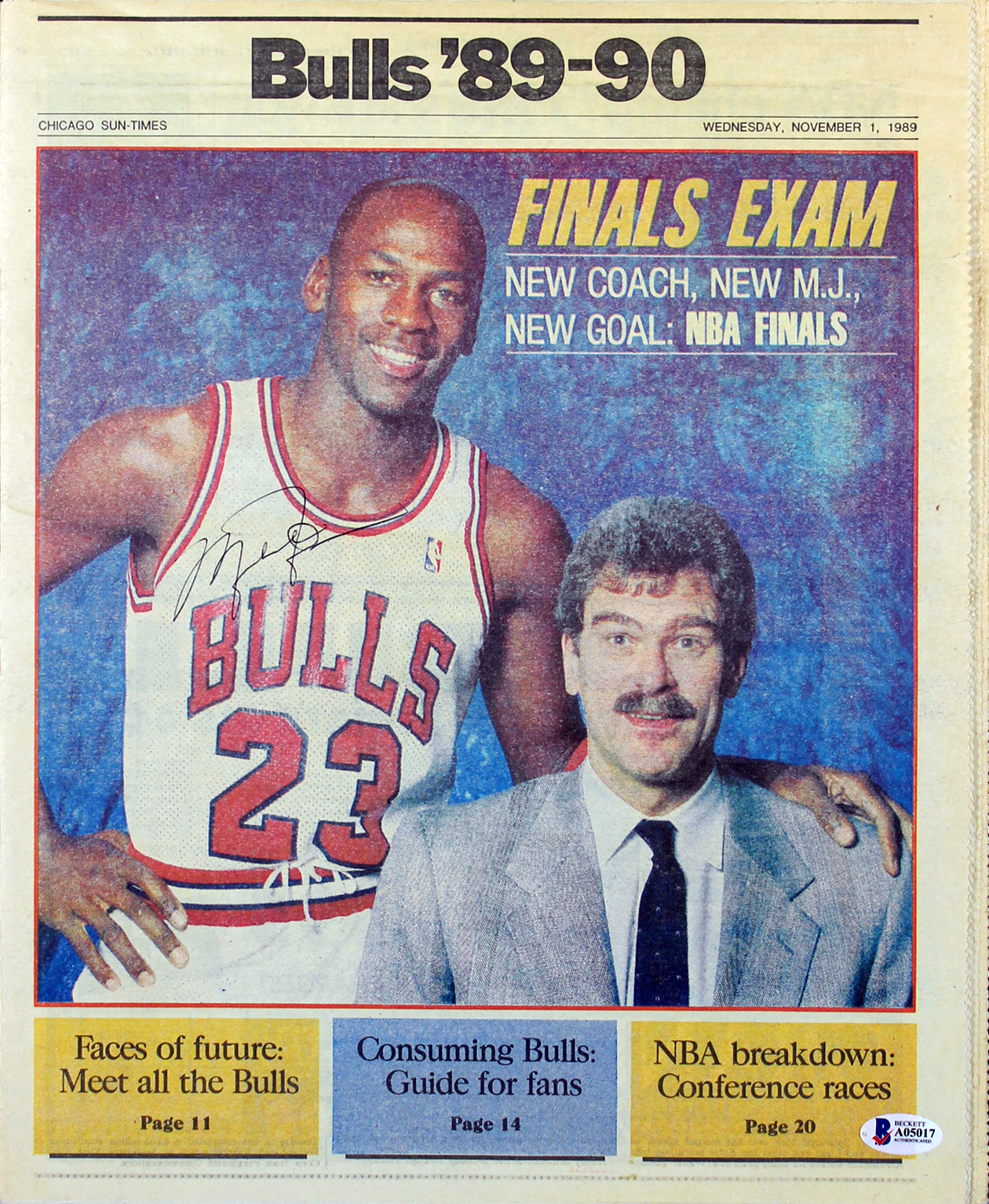 Chicago Sun-Times Sports Insert is dated Wednesday, November 1, 1989 and has been hand-signed in black ink pen by Michael Jordan (Chicago Bulls, HOF). Please see images for details regarding the condition of the newspaper insert.