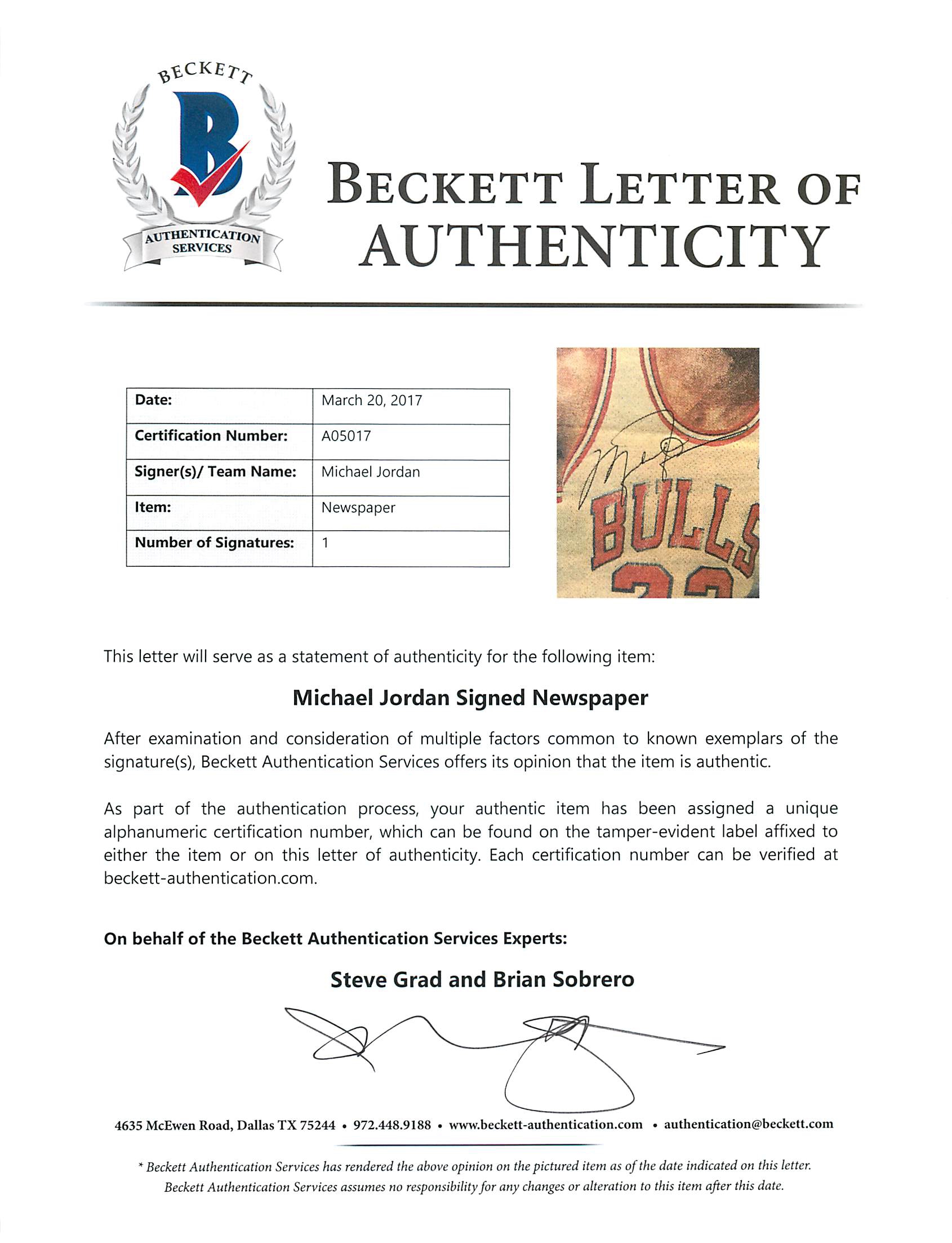 The lot / autograph(s) includes an official Beckett Authentication Services hologram and matching LOA for authenticity purposes.