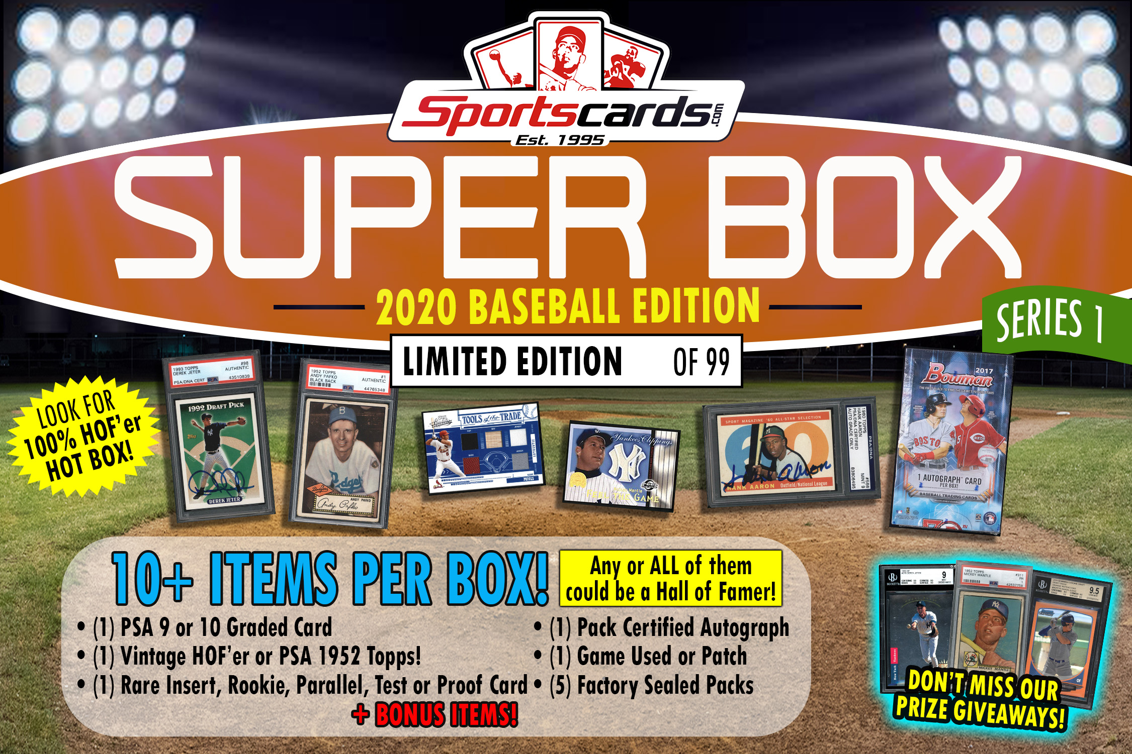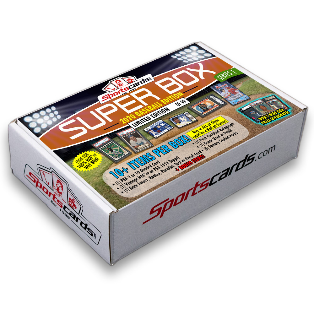 Sportscards.com “SUPER BOX” 10+ Cards & Packs PER BOX!! Baseball Edition, Series 1 limited to only 99 Boxes. We loaded these boxes with the best of the best – just check out the pics!