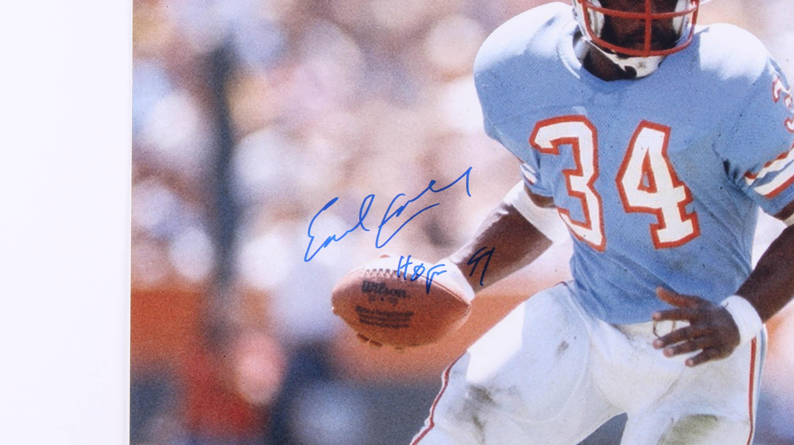 Photo measures 16" x 20" in size and has been hand-signed in blue felt-tip pen by Earl Campbell (Houston Oilers, HOF).