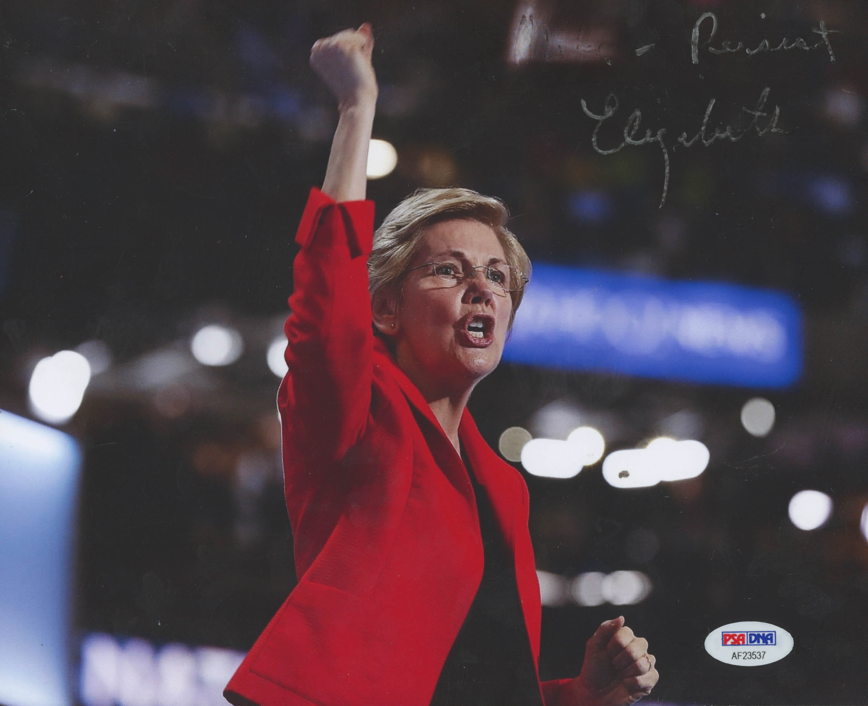 Photo measures 8" x 10" in size and has been hand-signed in silver paint pen by Elizabeth Warren. Please note this photo has been personalized to "Mike." Please see the photo for details regarding condition.