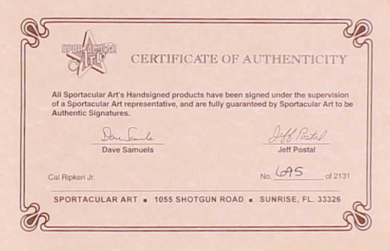 Limited edition litho plate measures 14.5" in diameter. Hand-signed in black felt-tip pen by Cal Ripken Jr. (Orioles HOF). The autograph includes an official James Spence Authentication (JSA) hologram and matching LOA and Sportacular Art hologram and COA for authenticity purposes.