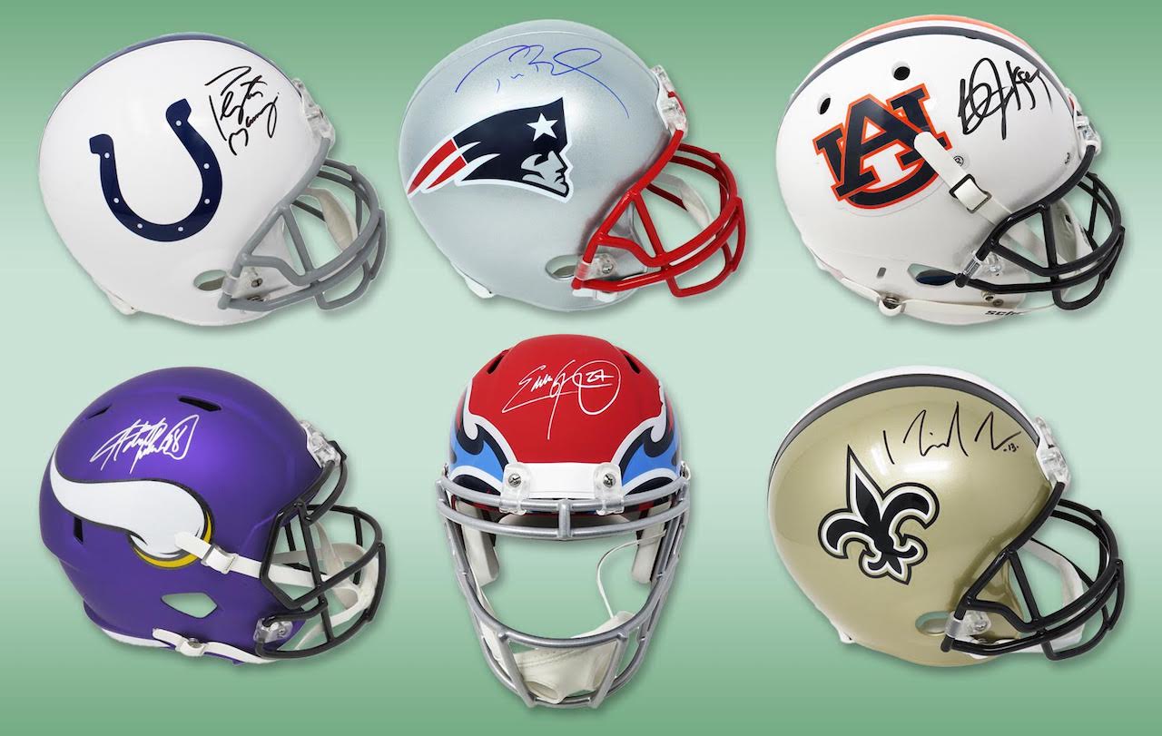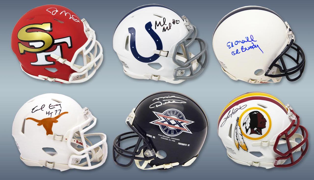 Each Football TOUCHDOWN Mystery Box contains at least six (6) autographed pieces of football memorabilia – a full-size helmet, custom football jersey, mini helmet, full-size football and two photos/encapsulated cards. There are over 160 different Players included in this Series 3 Touchdown Mystery Box, which is a Pristine Exclusive Edition that is limited to 112 boxes.