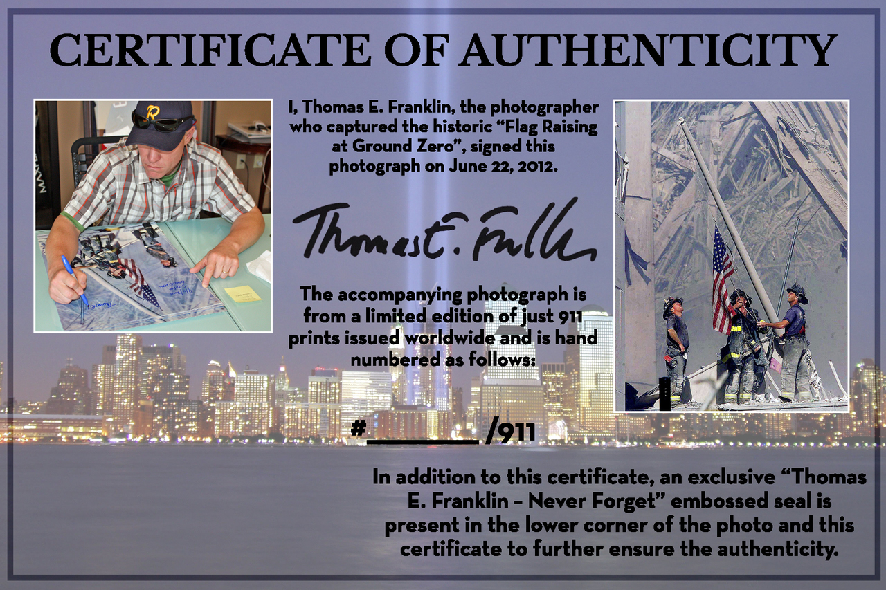 Photo measures approximately 16" x 20" and has been hand-signed in blue felt-tip pen by the photographer, Thomas E. Franklin.