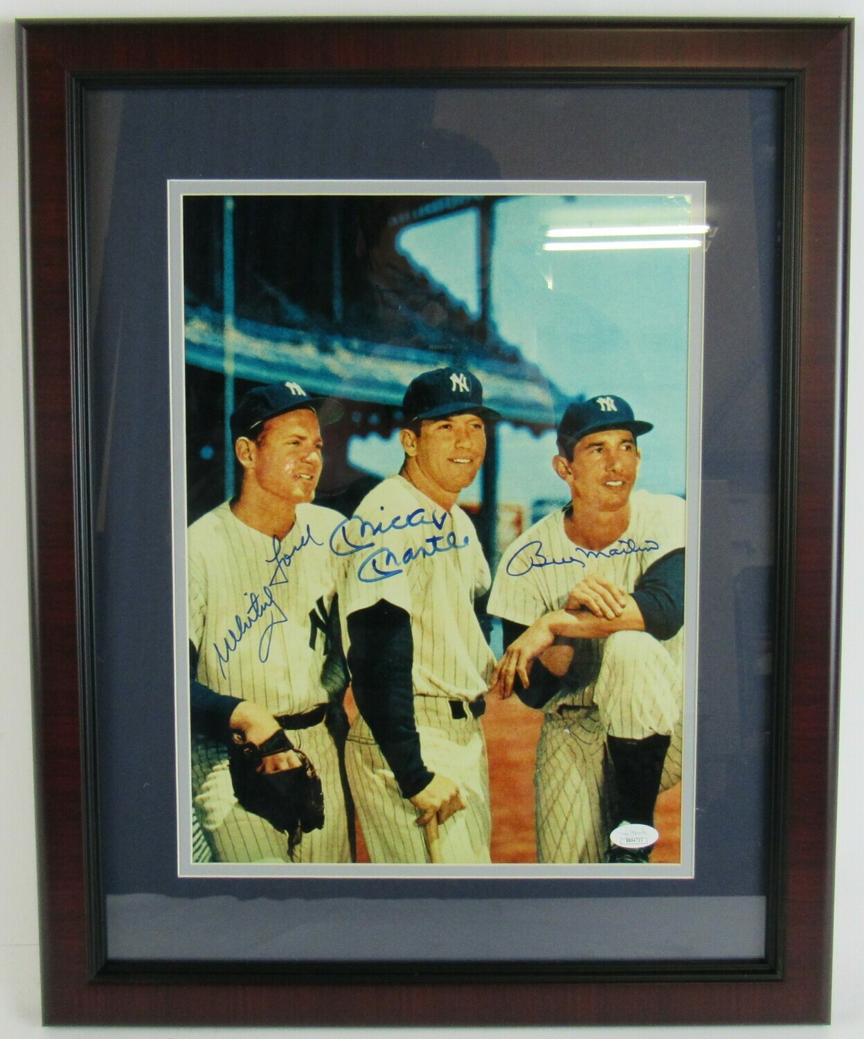 Custom framed display measures approximately 16" x 20" in size and has been hand-signed in blue felt-tip pen by Mickey Mantle (D. 1995, New York Yankees, HOF), Whitey Ford (New York Yankees, HOF) and Billy Martin (D. 1989, New York Yankees).
