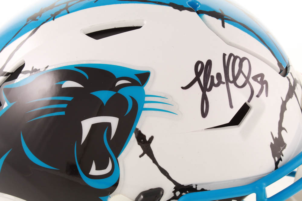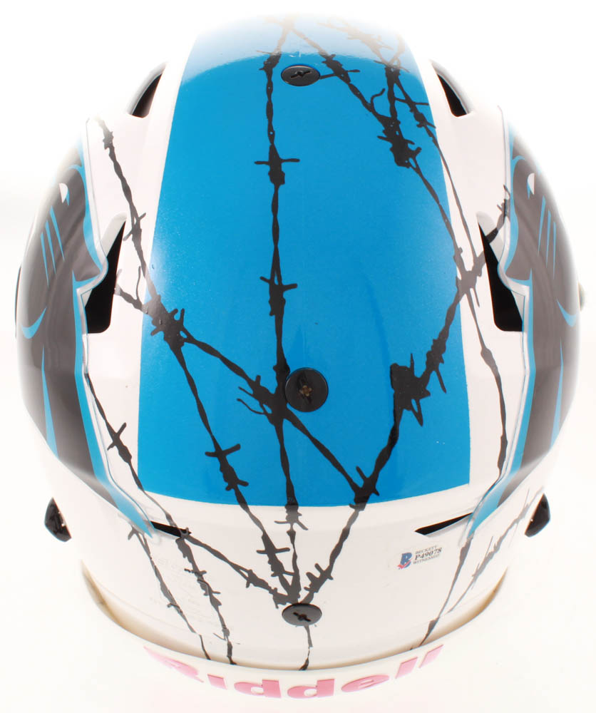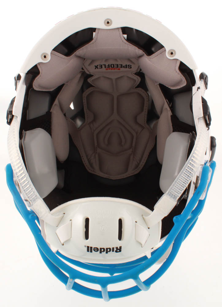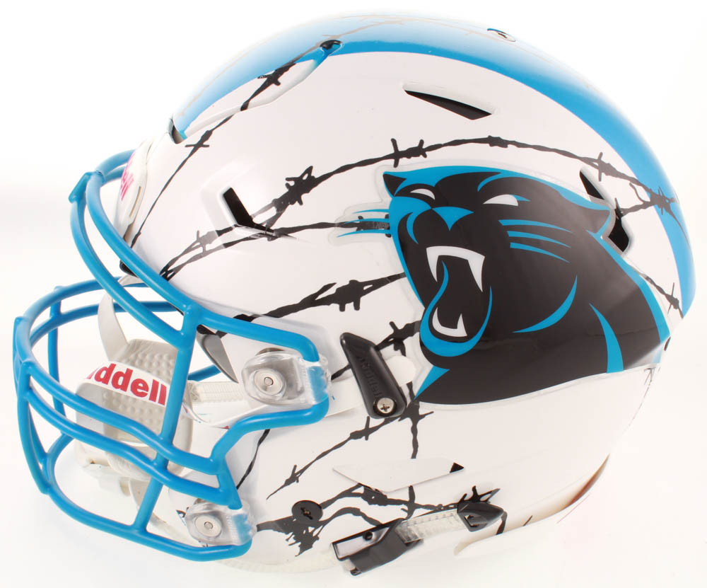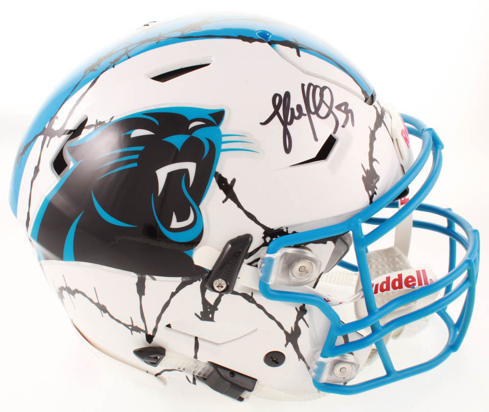 Riddell Carolina Panthers full-size authentic on-field hydro-dipped SpeedFlex youth helmet. Hand-signed in black felt-tip pen by Luke Kuechly.