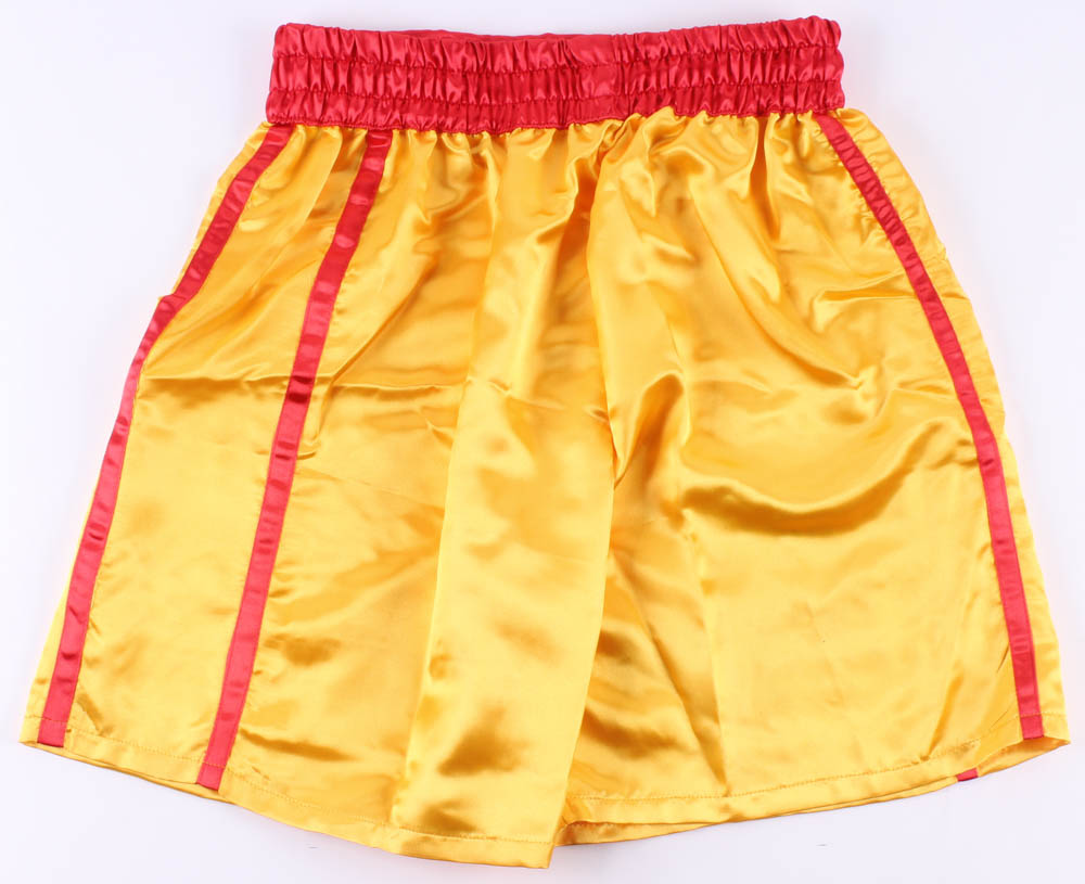 Custom Russian boxing trunks have been hand-signed and inscribed in silver paint pen by Dolph Lundgren.