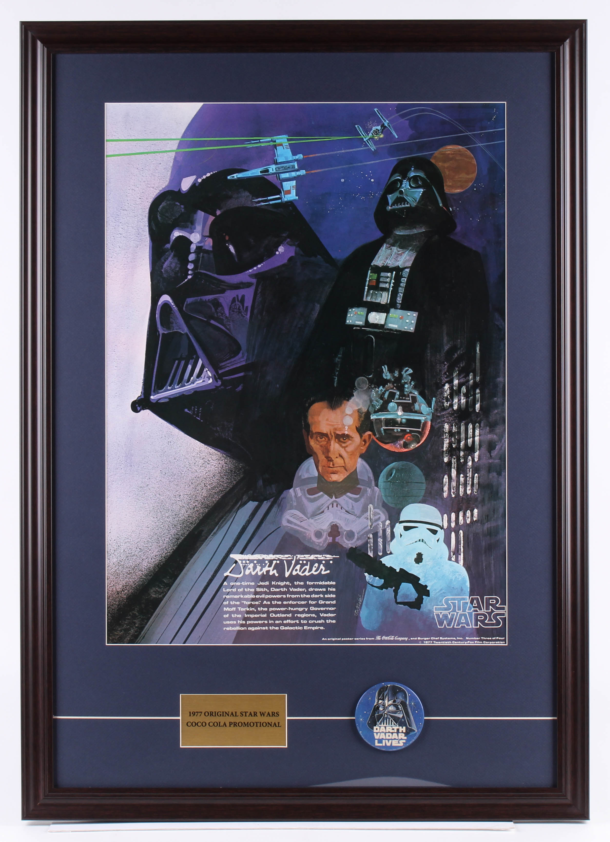 Vintage 1977 Coca Cola Star Wars 24.5x34.5 Custom Framed Poster Display with Original 1977 Darth Vader Pin