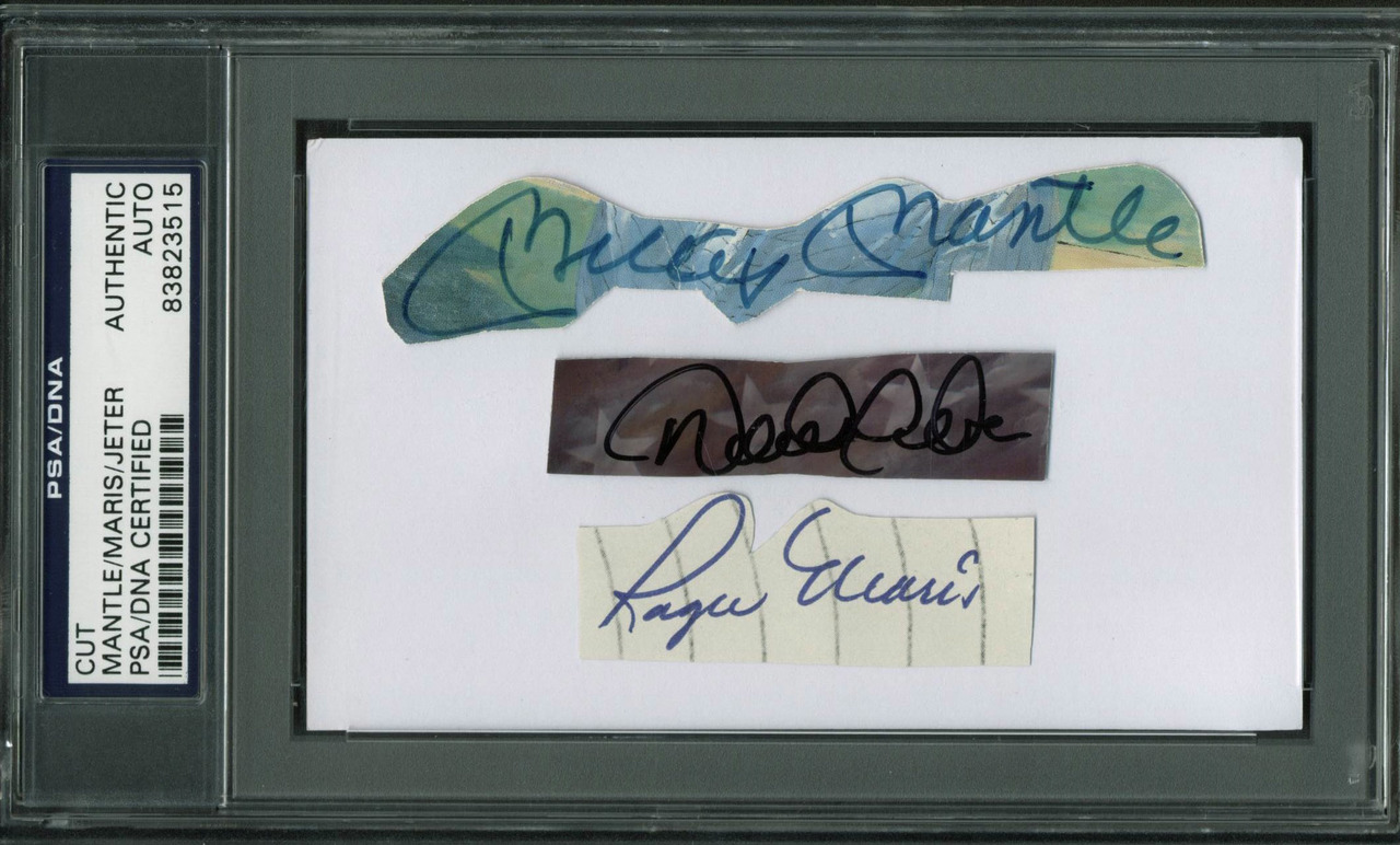 Mickey Mantle, Derek Jeter & Roger Maris Signed 3x5 Cut (PSA Encapsulated)