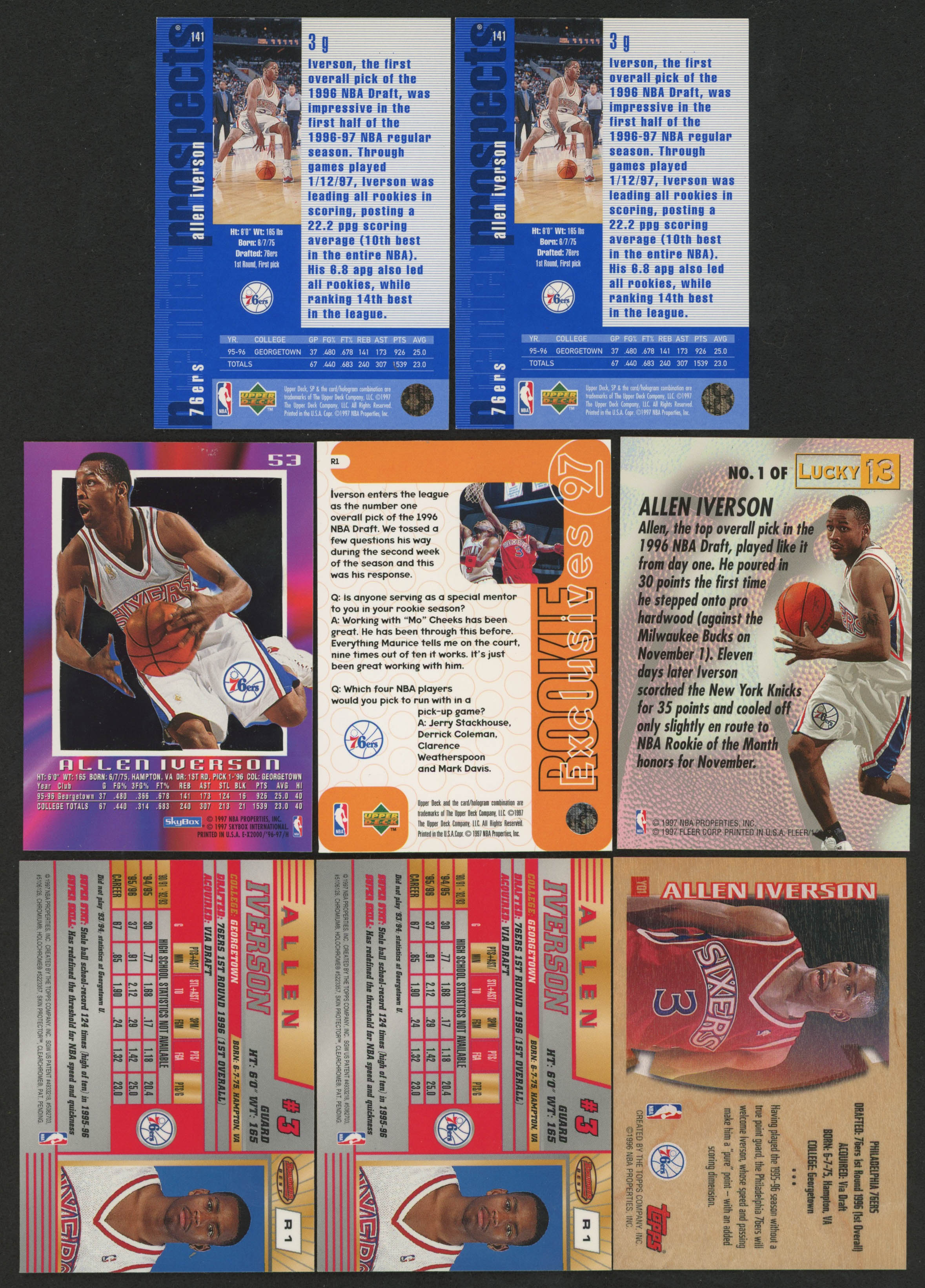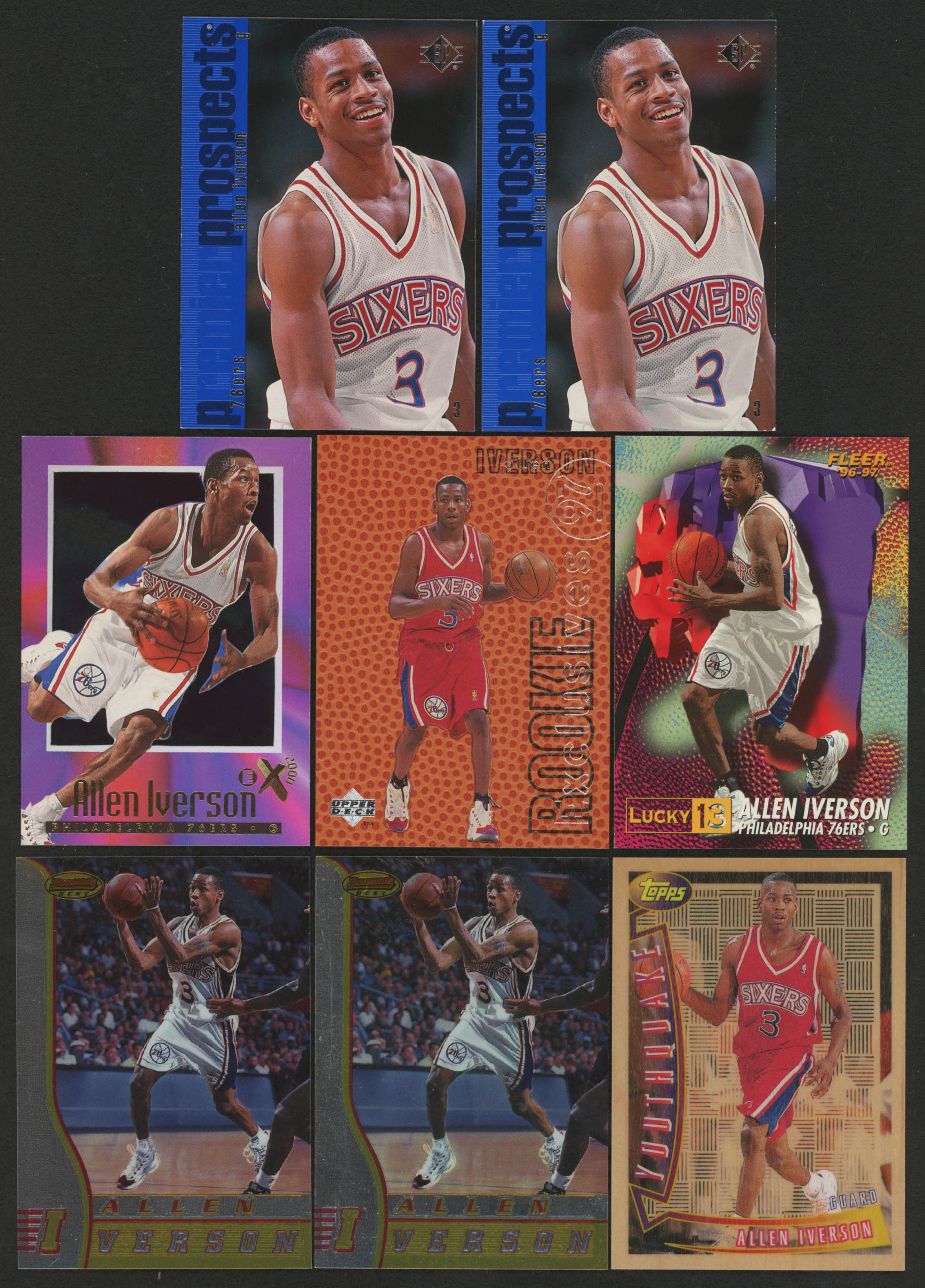 Lot of (8) Allen Iverson Rookie Basketball Cards with 1996-97 SP #141 RC, 1996-97 E-X2000 #53 RC, 1996-97 Bowman's Best #R1 RC, 1996-97 Upper Deck Rookie Exclusives #R1