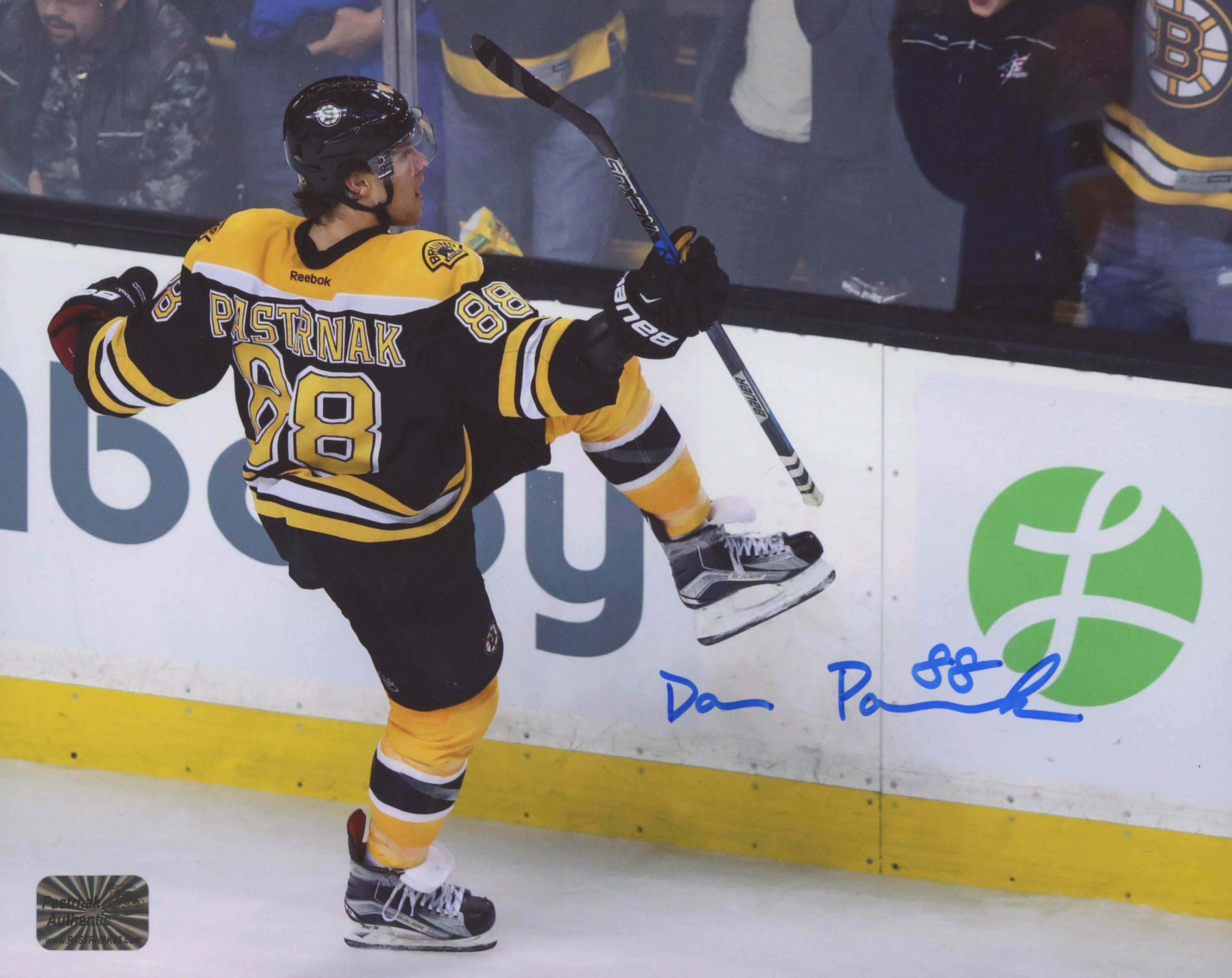 Photo measures 8" x 10" in size and has been hand-signed in blue felt-tip pen by David Pastrnak.(Boston Bruins)