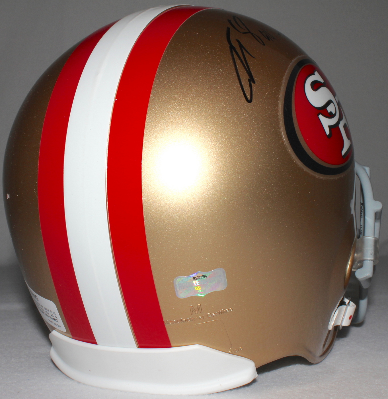 Riddell full-size replica helmet. Hand-signed and inscribed in black felt-tip pen by Justin Smith. The autograph includes an official Radtke Sports hologram and matching COA for authenticity purposes.