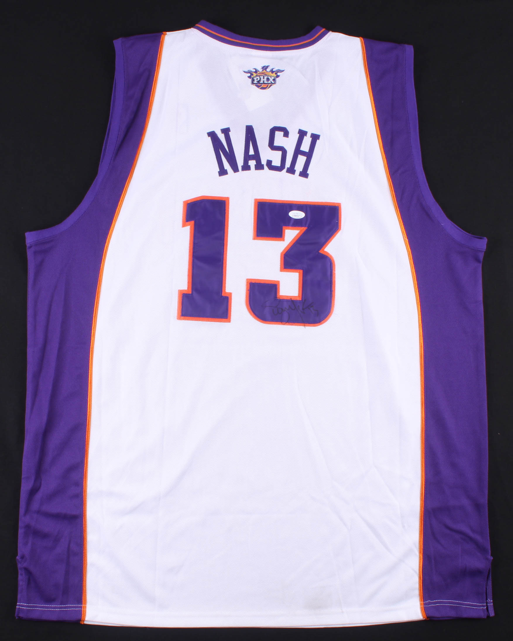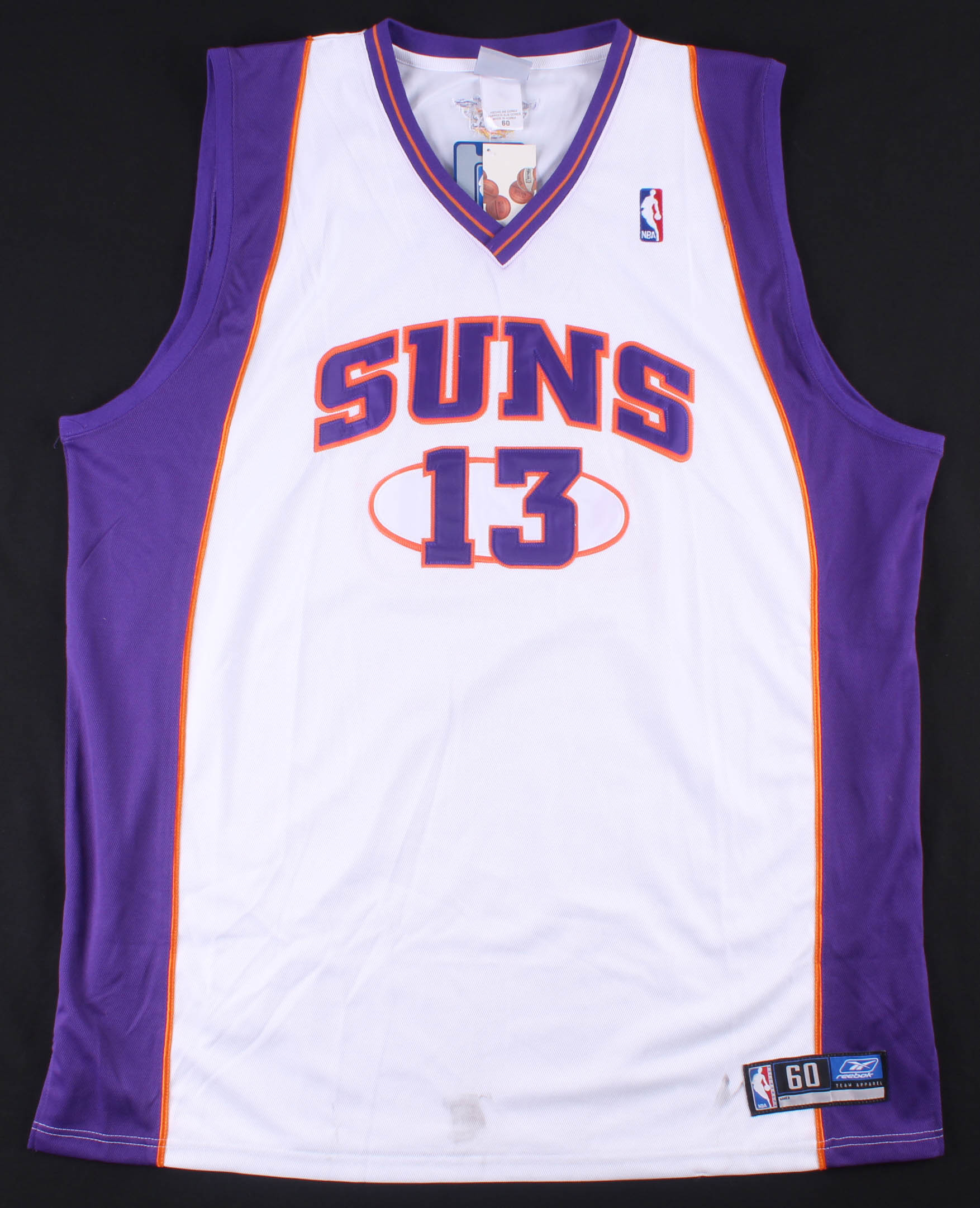 Reebok on court style jersey with everything sewn on, size 60. Jersey has been hand-signed in black felt-tip pen by Steve Nash. (HOF) Please note the jersey has minor staining.