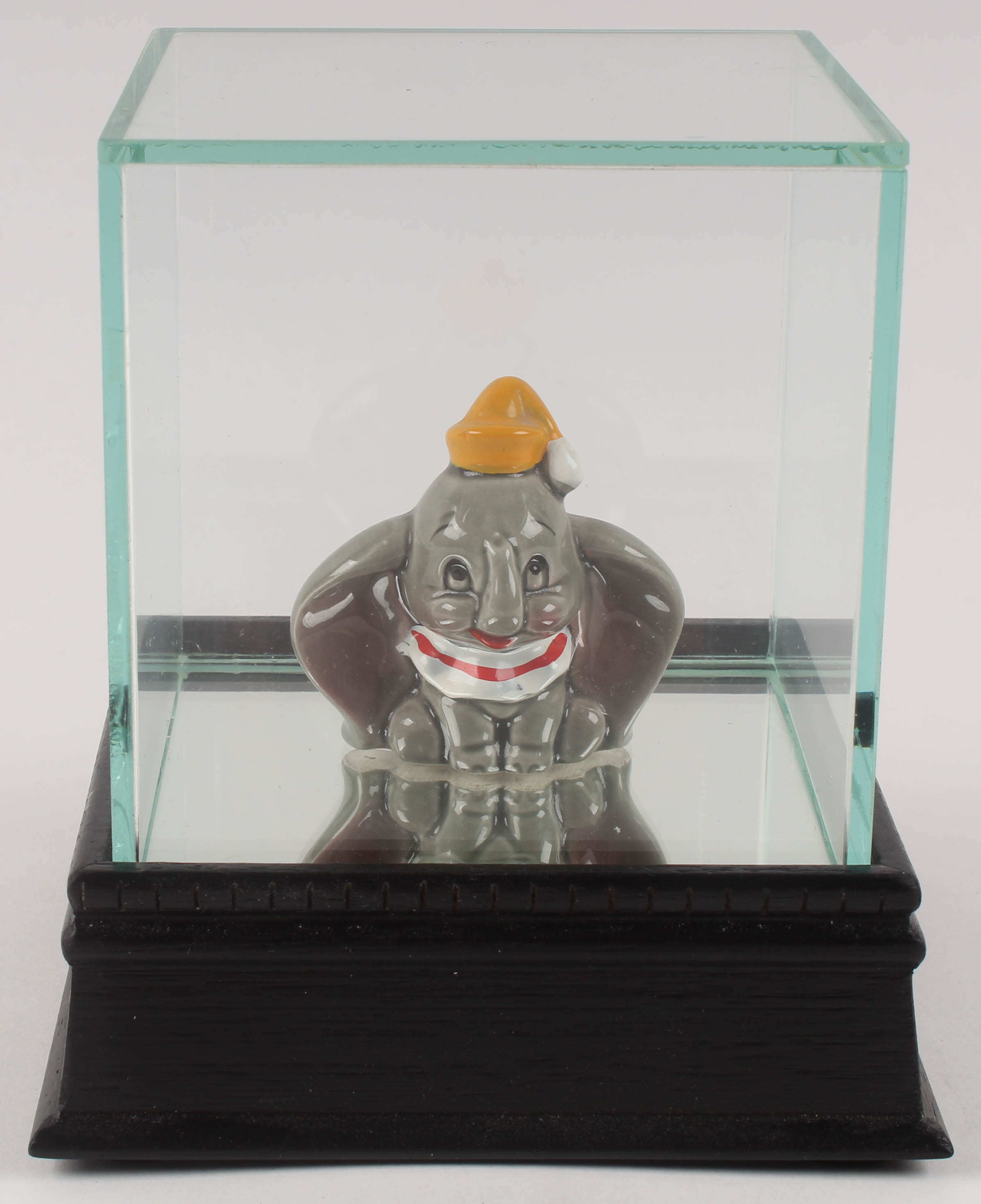Vintage 1970 Dumbo figurine measures approximately 2" in size. The auction also includes a Steiner display case with a wood base and glass cube. Please see photos for more details.
