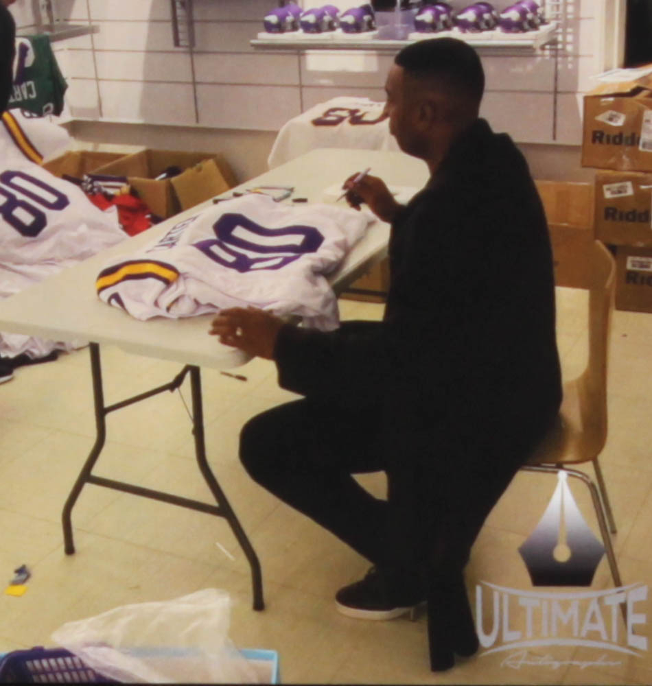 Custom on-field style jersey. Everything is sewn on, size XL. Has been hand-signed in black felt-tip pen by Cris Carter (HOF).