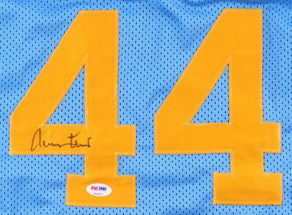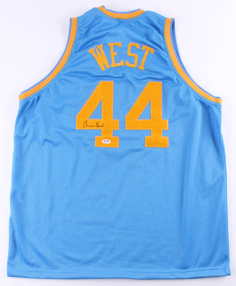 Custom on-court style jersey. Everything is sewn on, size XL. Hand-signed in black felt-tip pen by Jerry West (HOF). Please see images for details regarding the condition of the jersey.