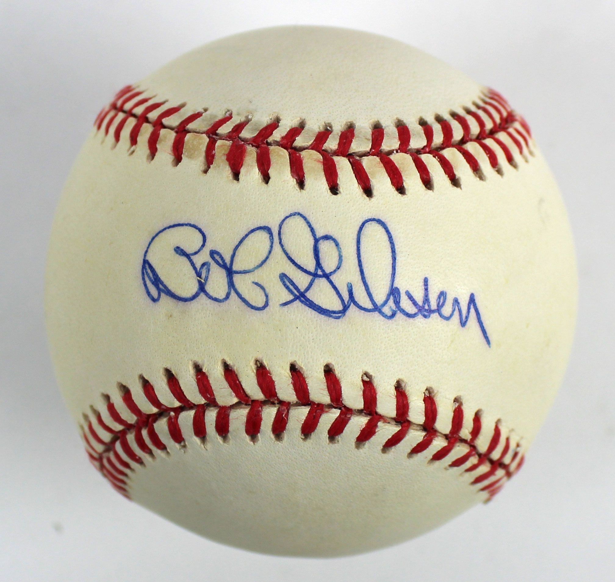 Rawlings Official National League Baseball. Hand-signed in blue ink pen by Bob Gibson (St. Louis Cardinals, HOF). Please note, the baseball shows signs of natural toning.