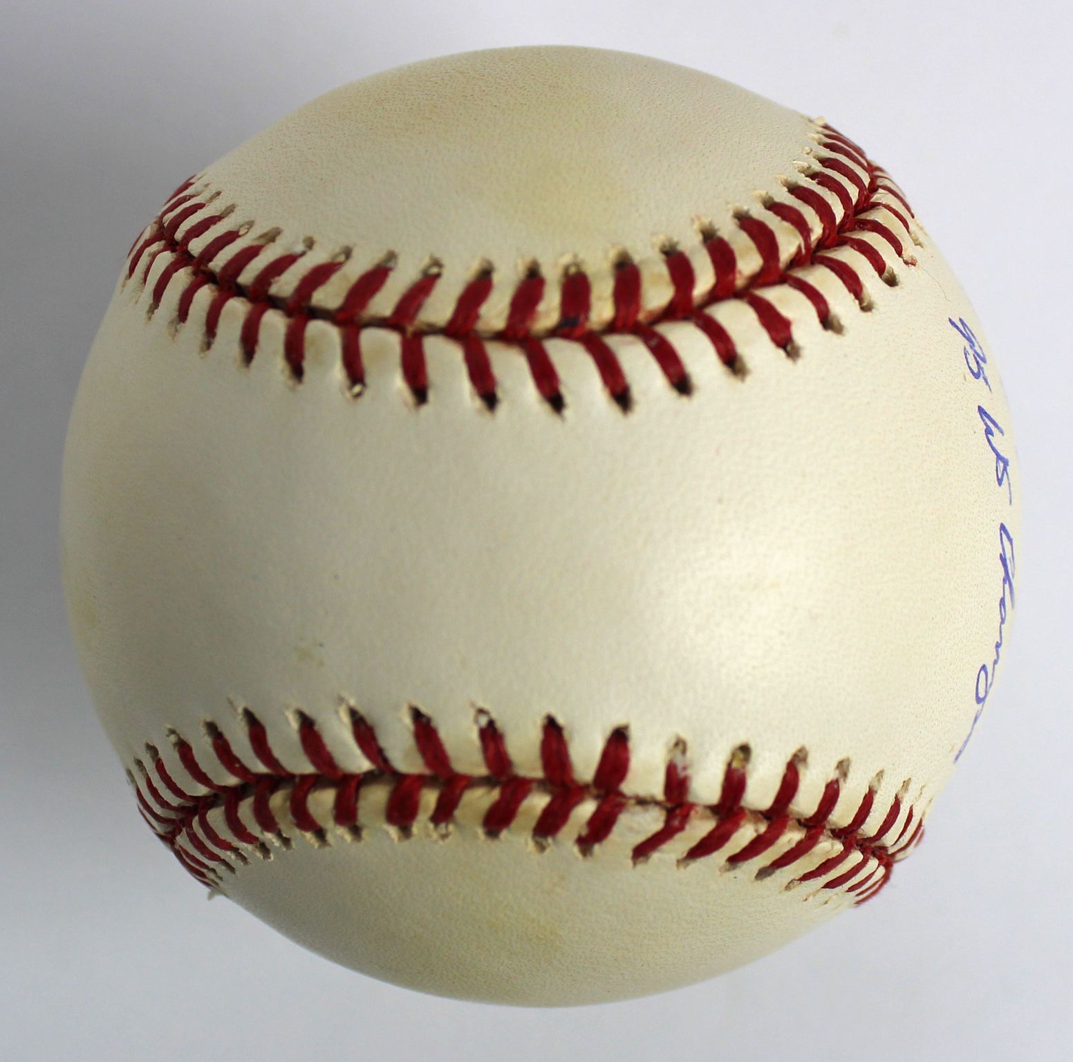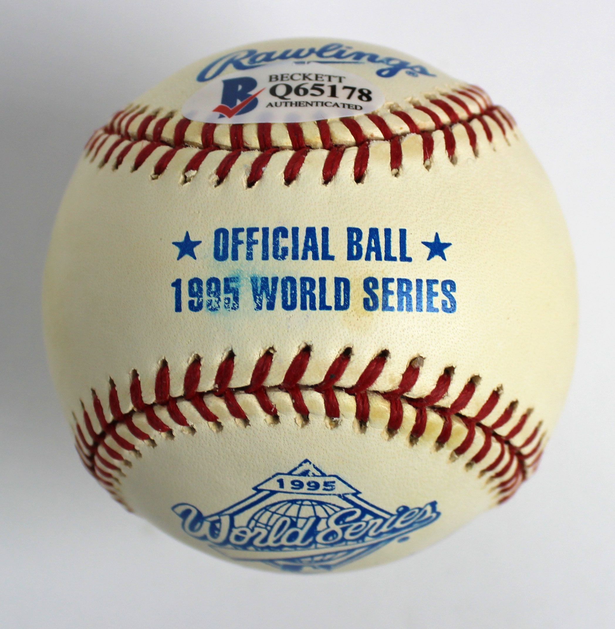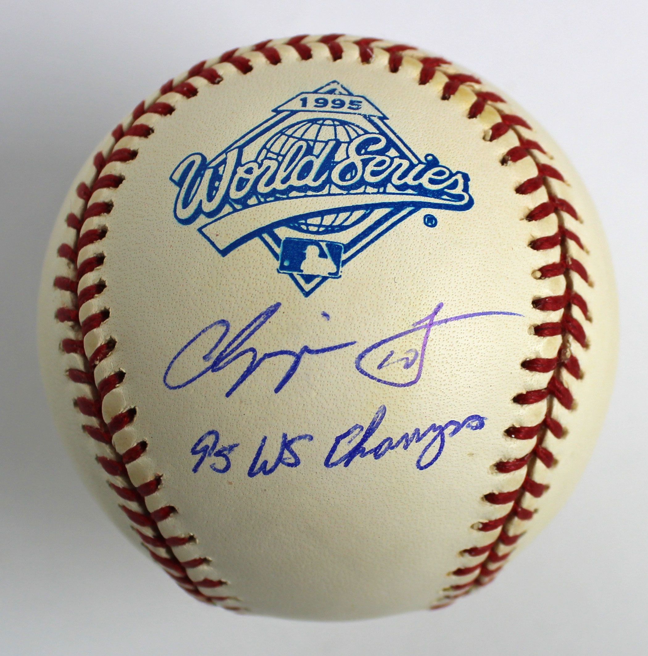 Rawlings Official 1995 World Series Baseball. Hand-signed and inscribed in blue ink by Chipper Jones (Atlanta Braves, HOF). Please note, baseball shows signs of natural toning.