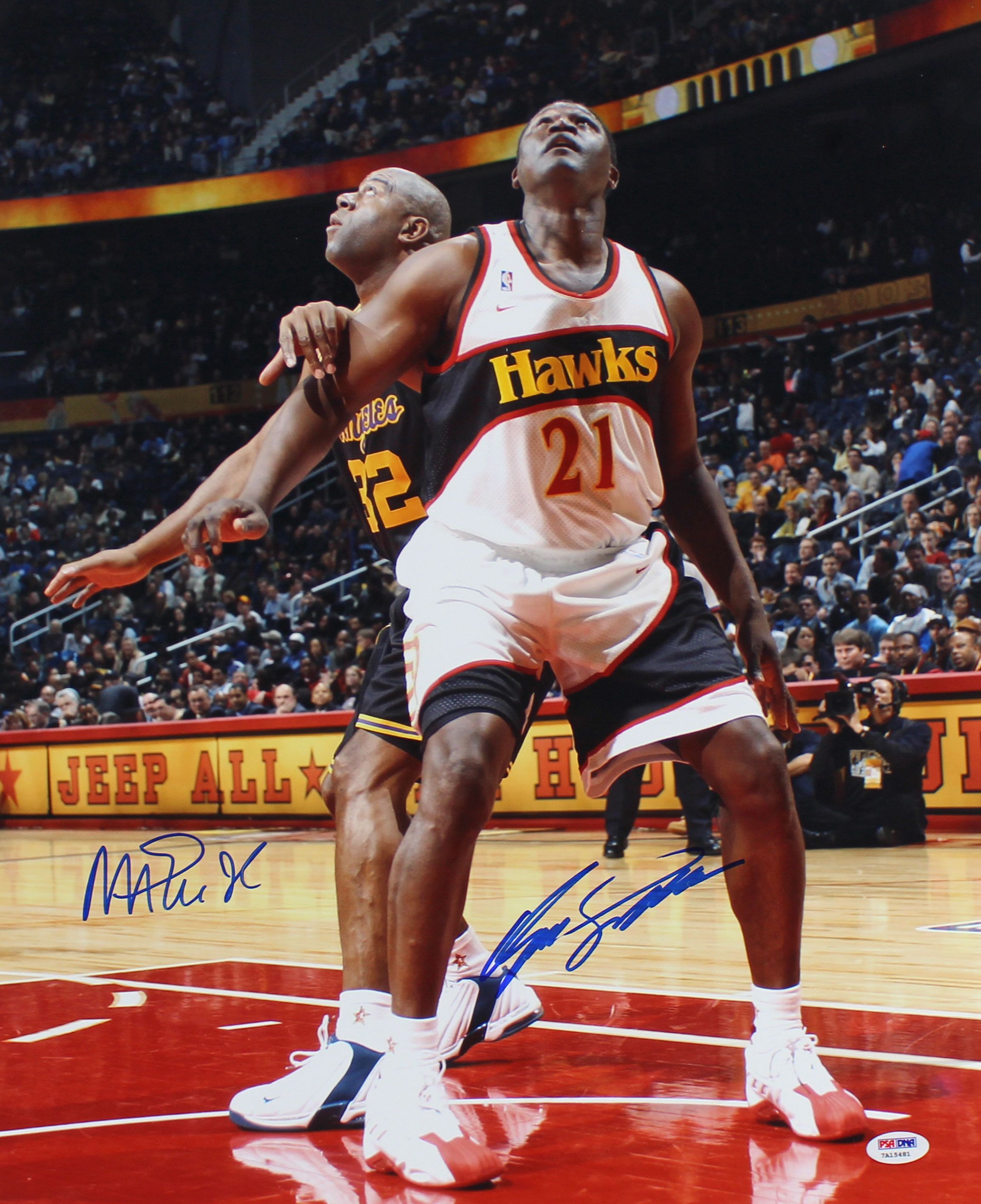 Photo measures 16" x 20" in size and has been hand-signed by Magic Johnson (Los Angeles Lakers, HOF) and Dominique Wilkins (Atlanta Hawks, HOF).