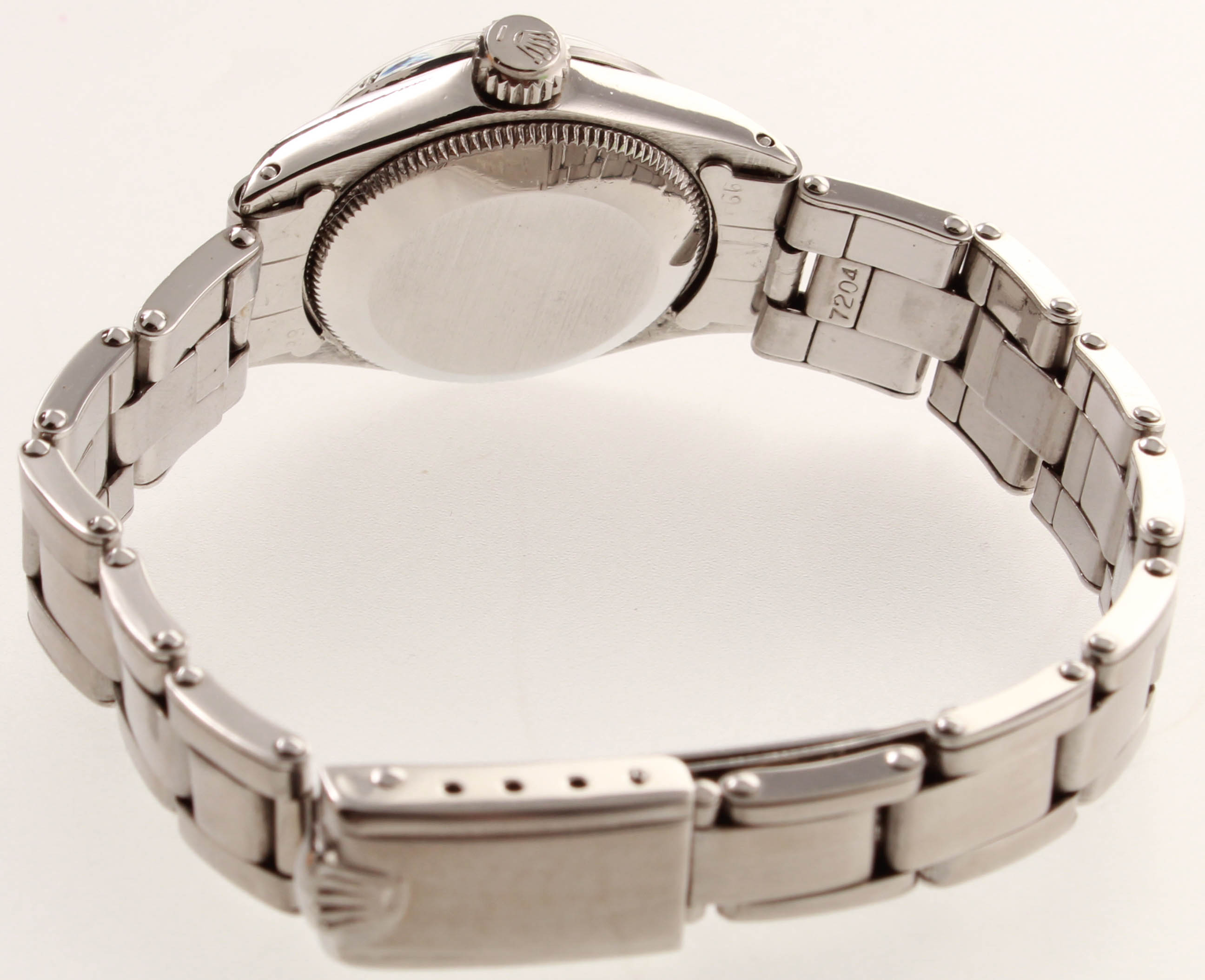 Ladies Rolex Oyster Perpetual Date Stainless Steel Wristwatch. 26mm Stainless steel screw case. Rolex Automatic winding C.O.S.C. Certified chronometer. While Roman numeral dial, and white gold engine turned bezel. Auction includes box as shown.