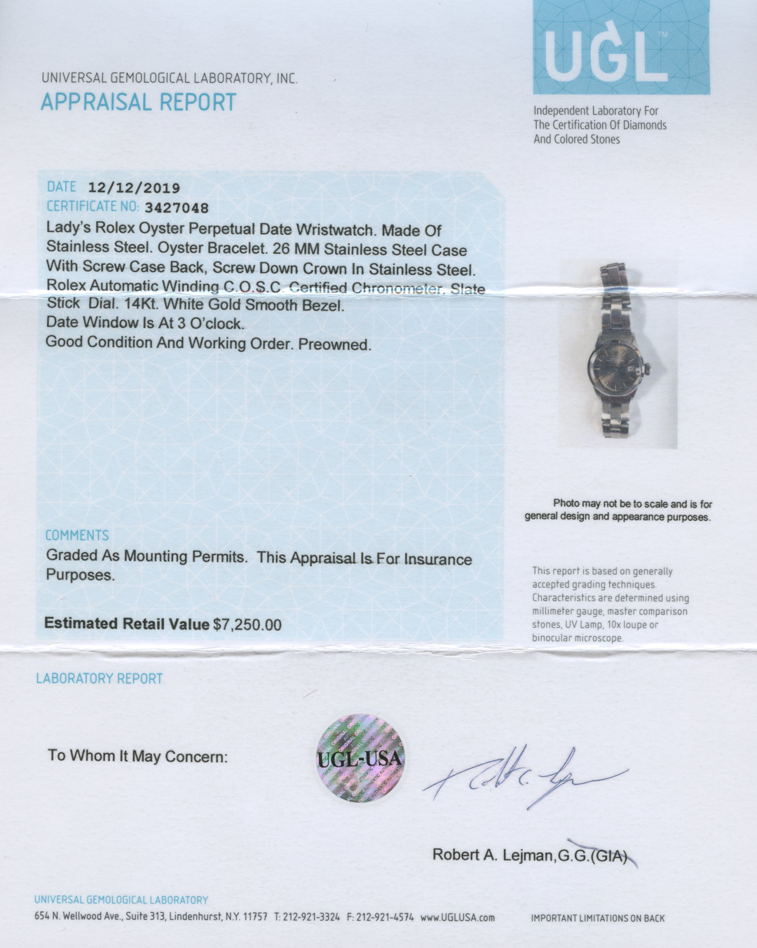 Ladies Rolex Oyster Perpetual Date Stainless Steel Wristwatch with Box (UGL Appraisal)