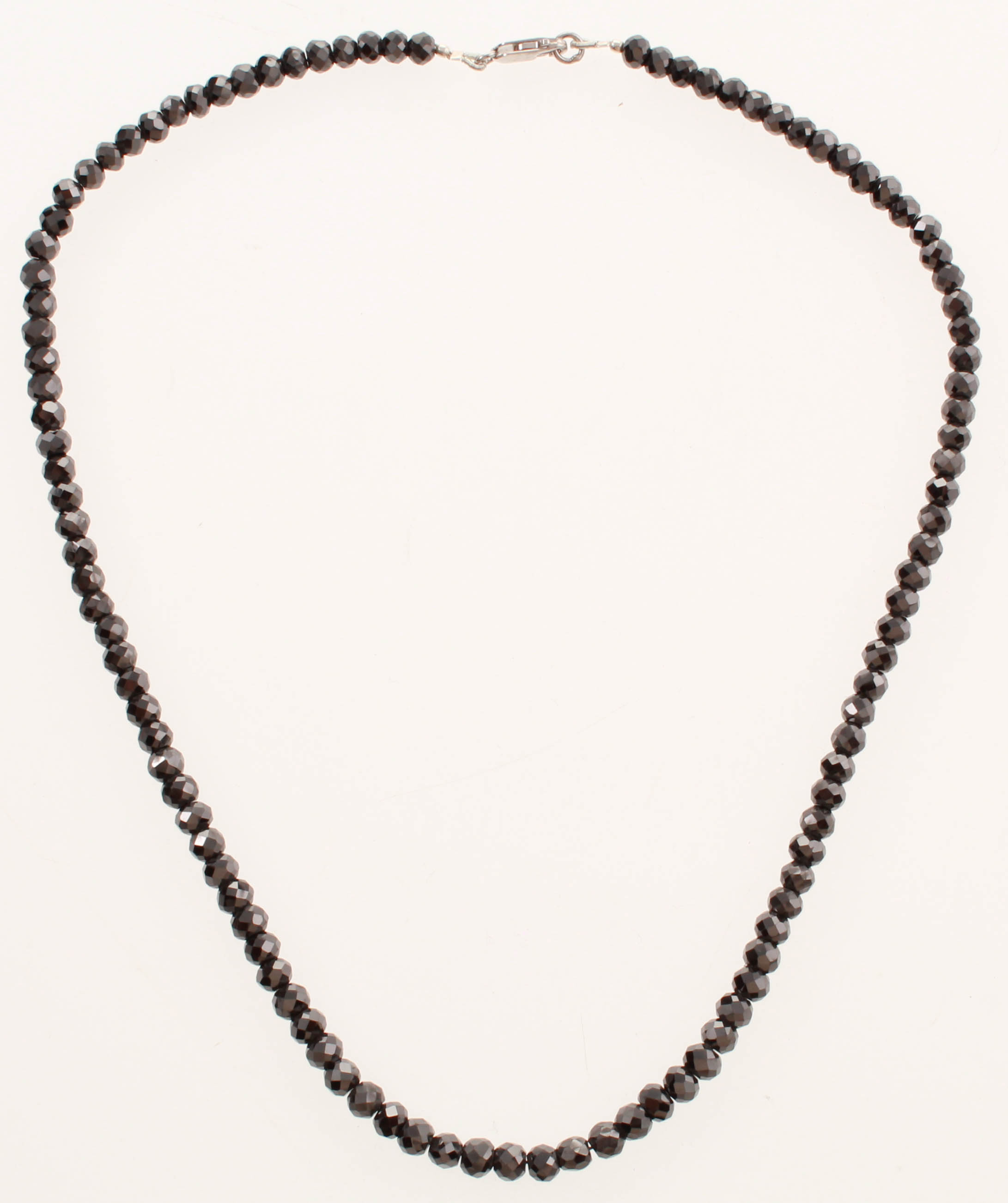 One ladies black diamond faceted bead necklace with a .925 sterling silver clasp. Neckalce measures 18" in length.