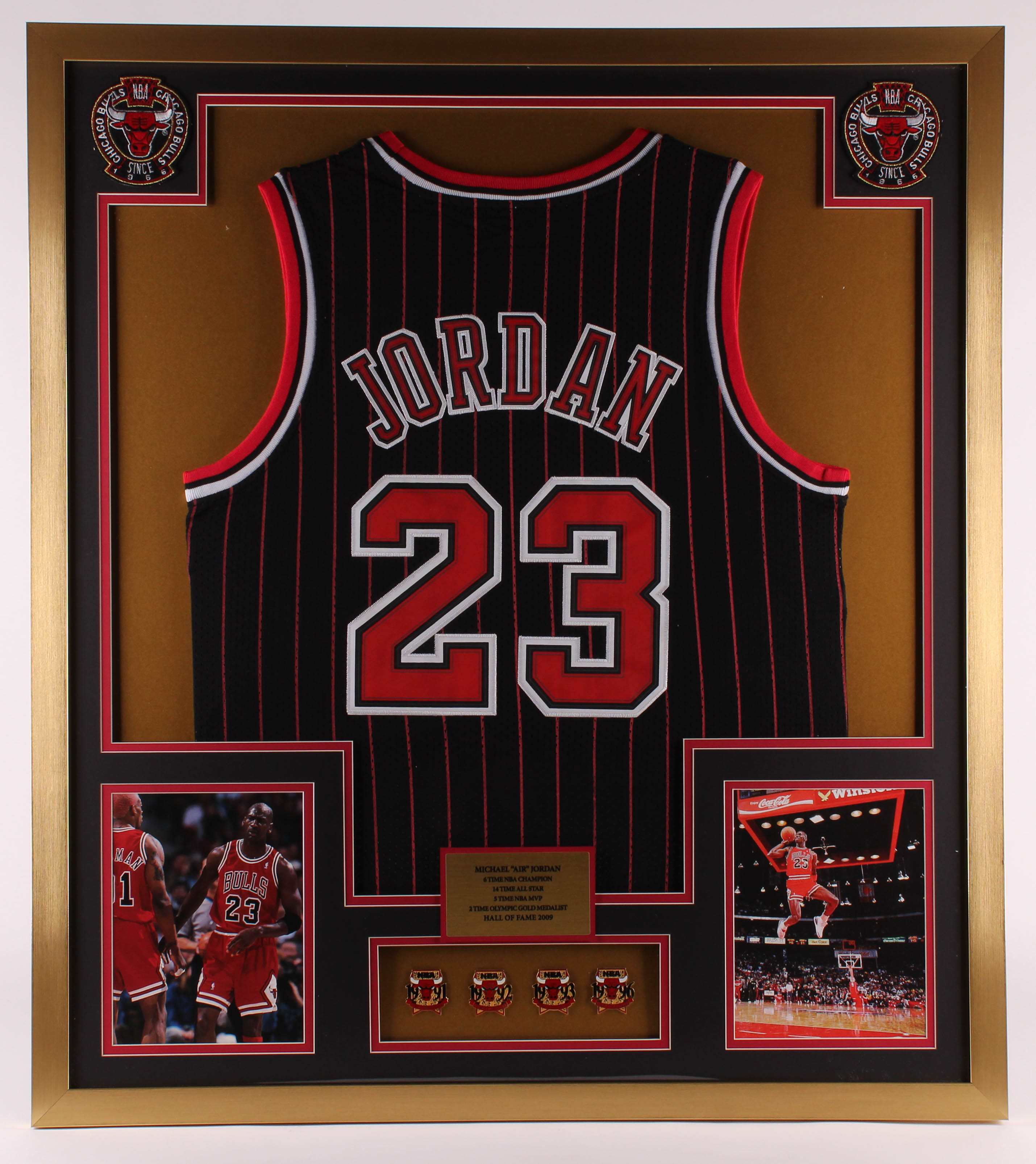 Michael Jordan Bulls 32x36 Custom Framed Jersey Display with (4) NBA Championship Pins