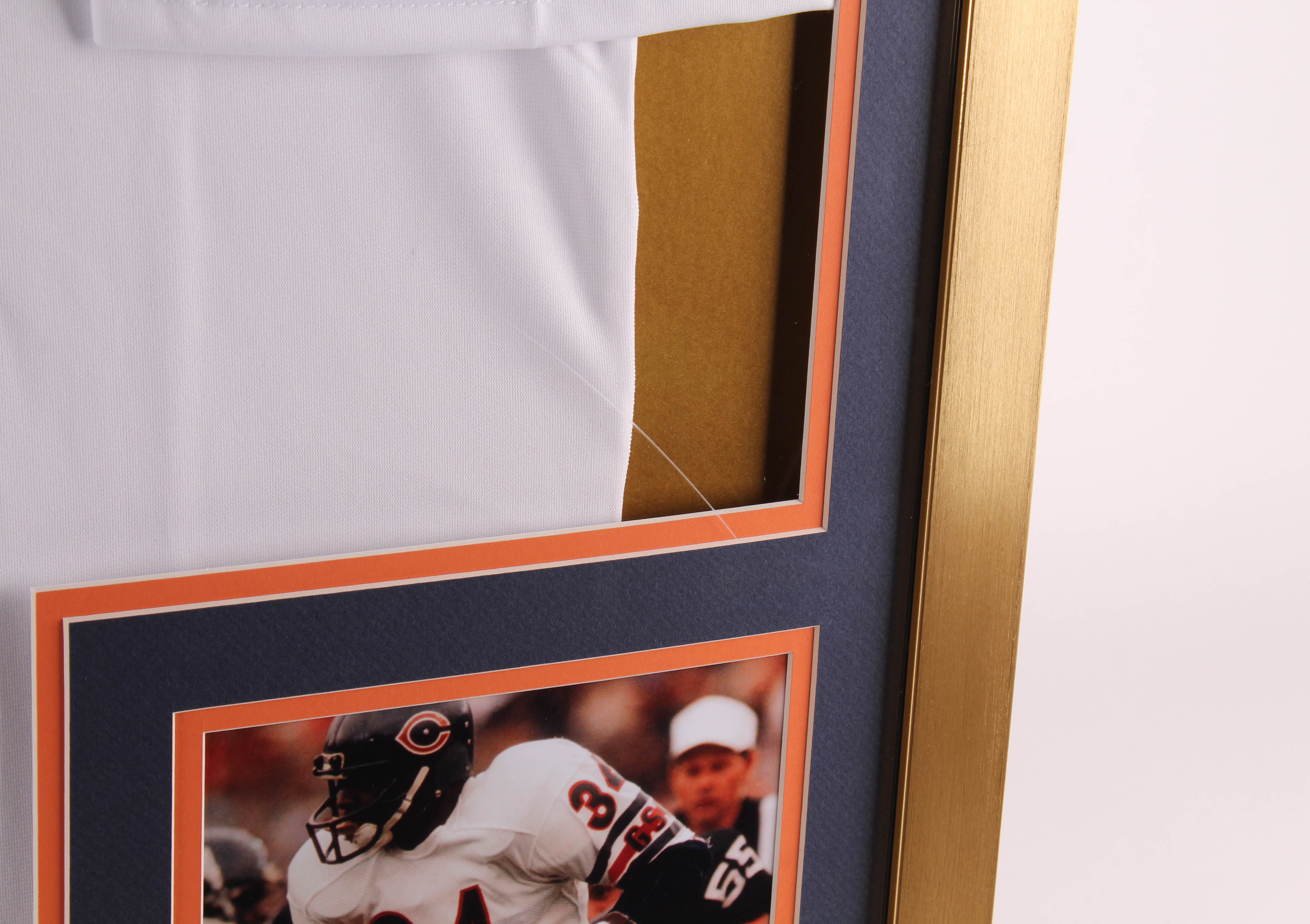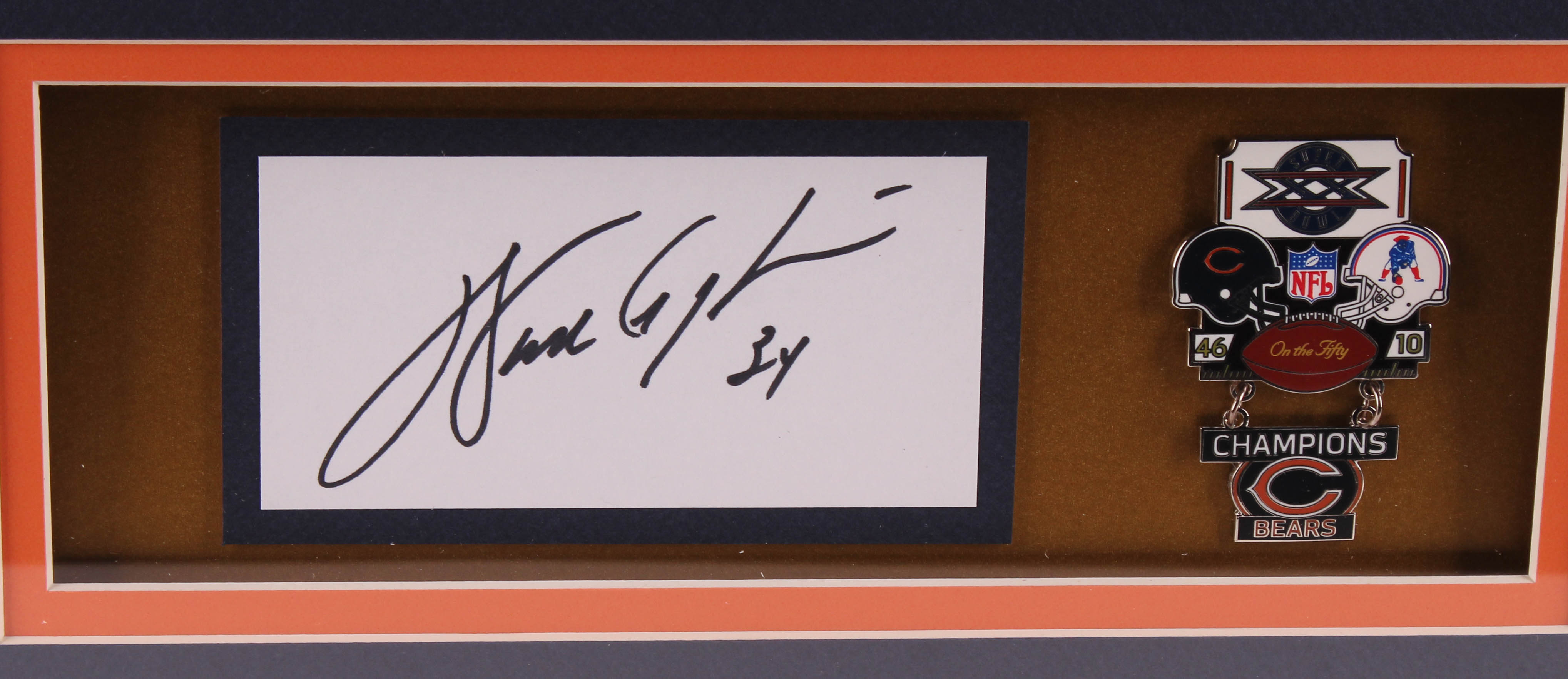 Custom frame measures 32" x 36" in size and features a cut that has been hand-signed in black felt-tip pen by Walter Payton (D. 1999, Chicago Bears, HOF). Display also features a Super Bowl pin.