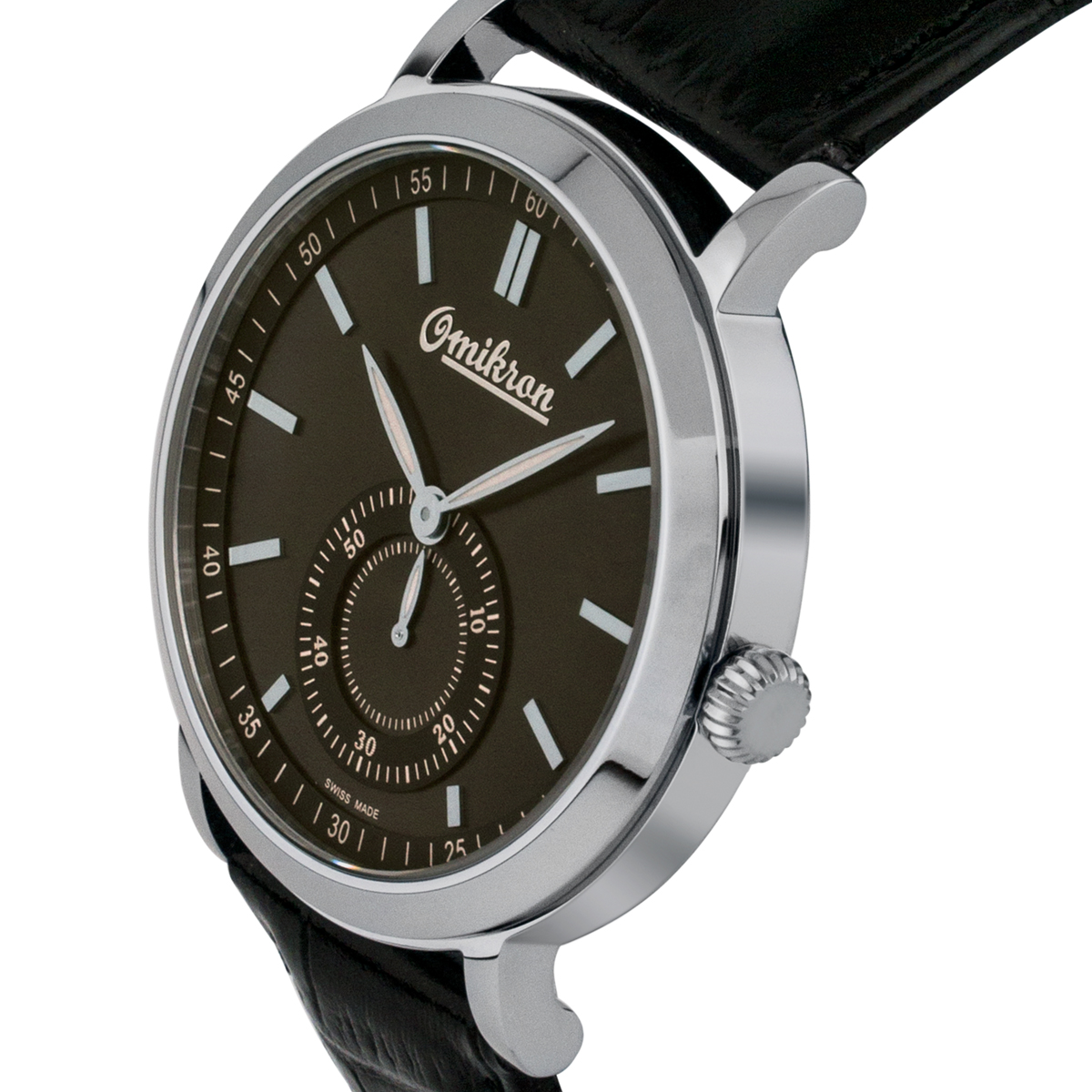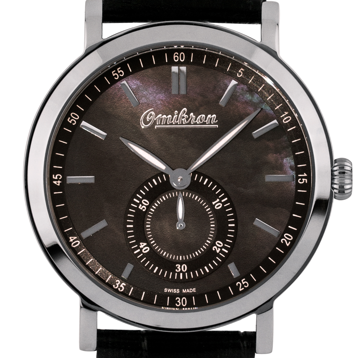 The Omikron Harrier Men's Vintage Style Watch features a black leather strap, silver case, and black mother-of-pearl dial. Please see photos for details.