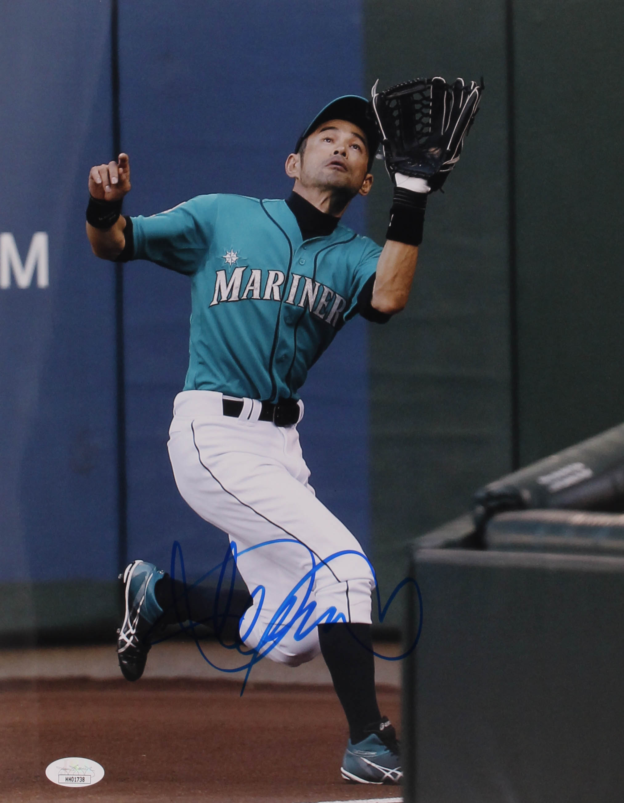 Photo measures 16" x 20" in size and has been hand-signed in blue felt-tip pen by Ichiro Suzuki (Seattle Mariners).