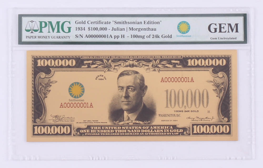 1934 $100,000 One Hundred Thousand Dollars "Smithsonian Edition" Gold Certificate - Woodrow Wilson (PMG Gem Uncirculated)