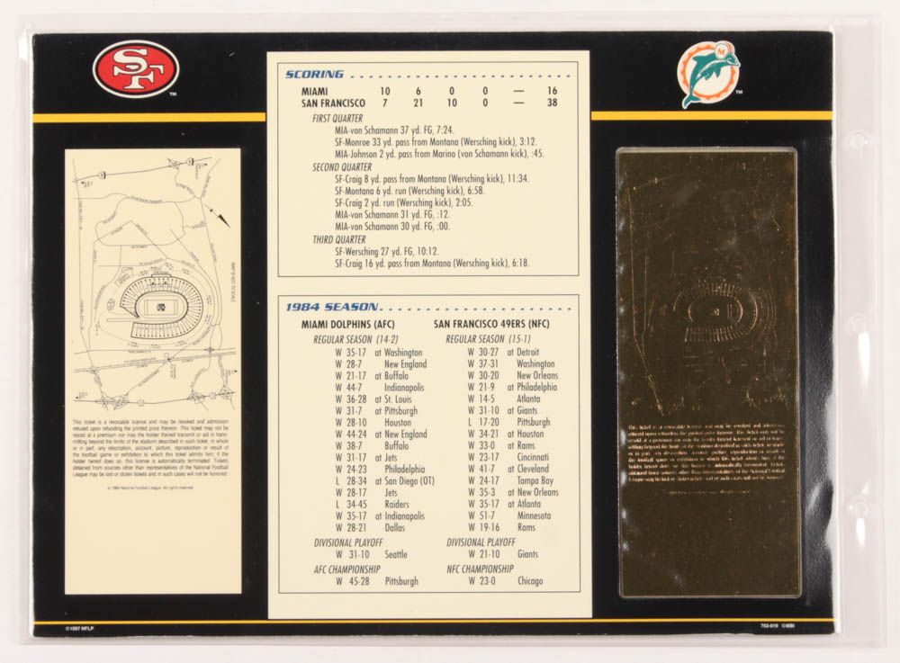 Official scorecard measures 9" x 12" in size with game stats on the reverse side. Features a San Francisco 49ers vs Miami Dolphins replica gold Super Bowl XIX ticket.