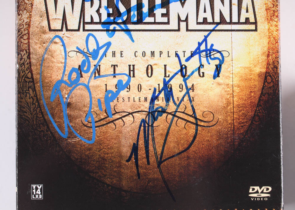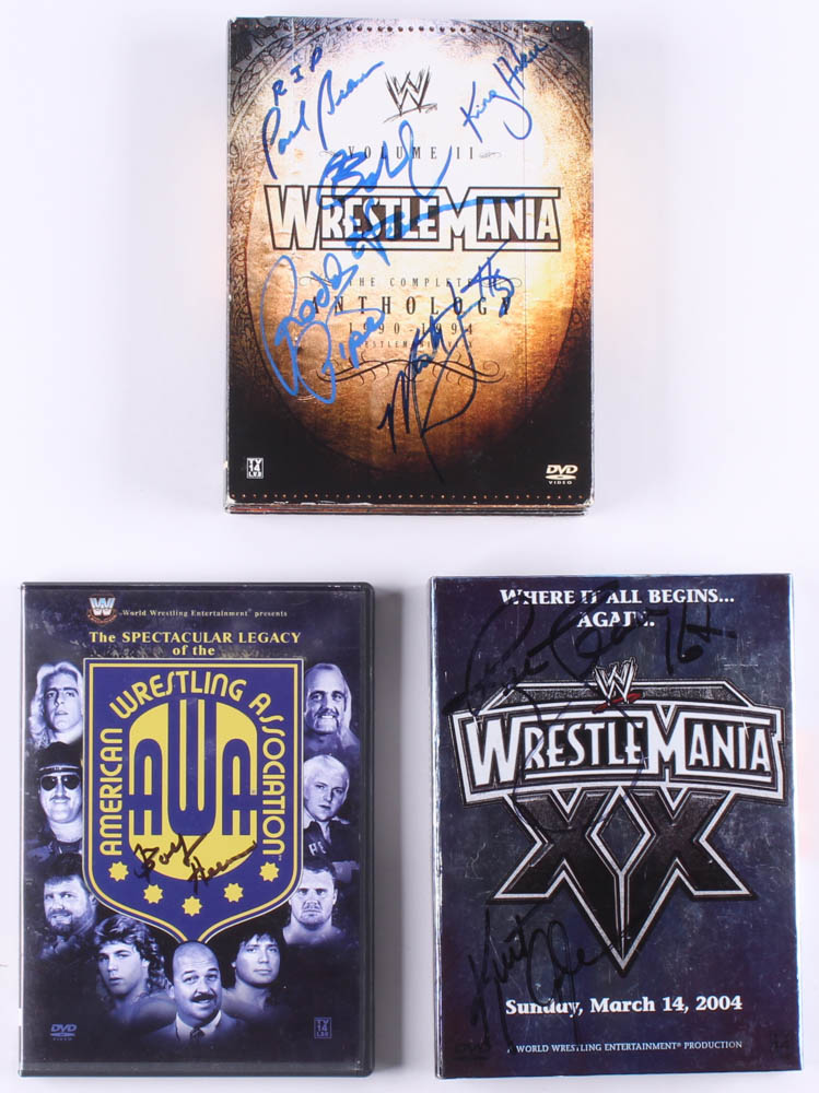 Lot includes all (3) Wrestling DVD Sets as shown. Each set has been hand-signed in blue and black felt-tip and blue paint pen by Rowdy Roddy Piper, Marty Jannetty, Ric Flair, Kurt Angle, Pain Warlord, Barbarian, King Haku and Bobby Heenan.