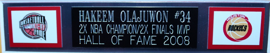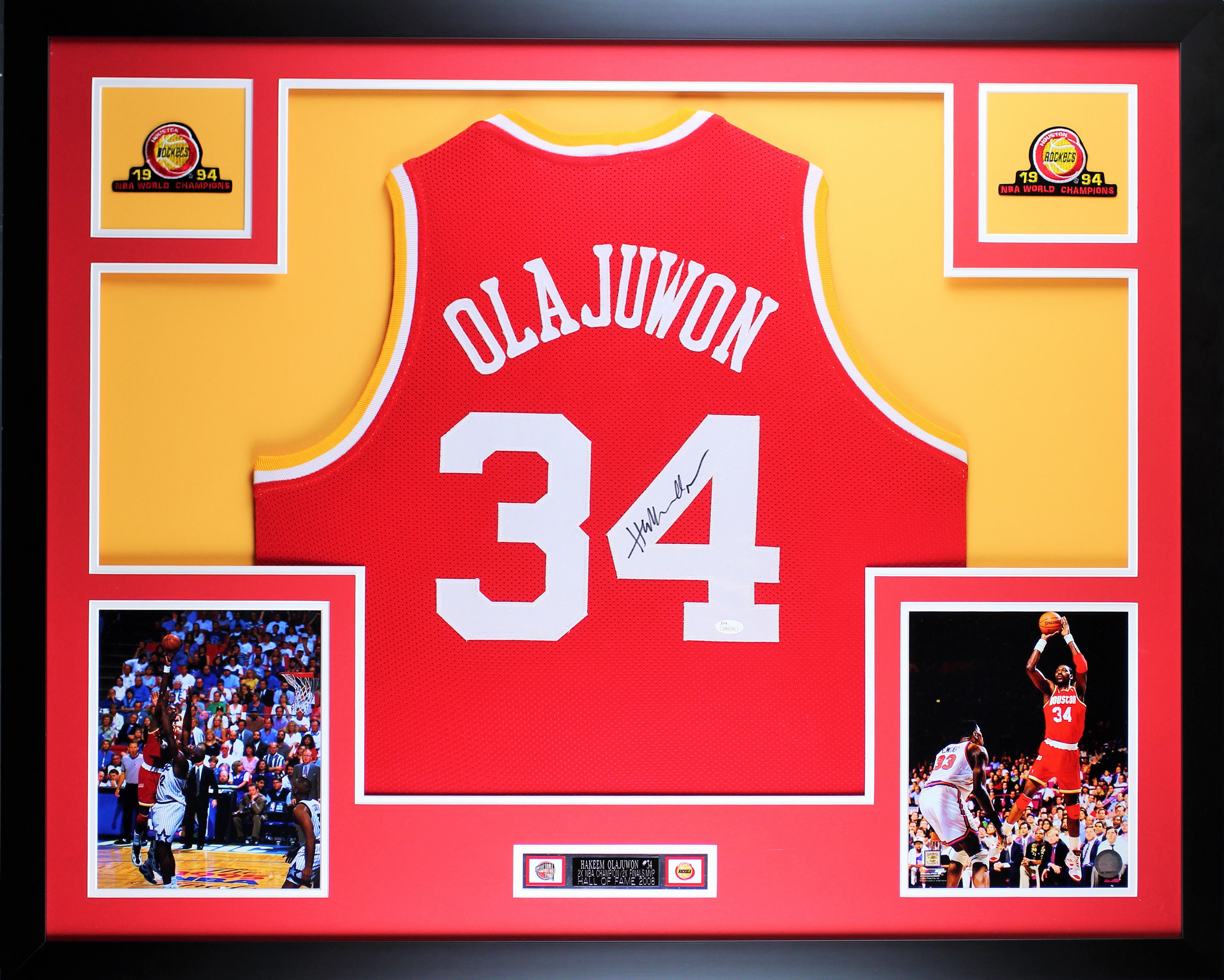 A beautifully framed autographed Hakeem Olajuwon Jersey. The autograph was certified by JSA and includes a sticker on the jersey and a matching certificate attached to the back of the frame.