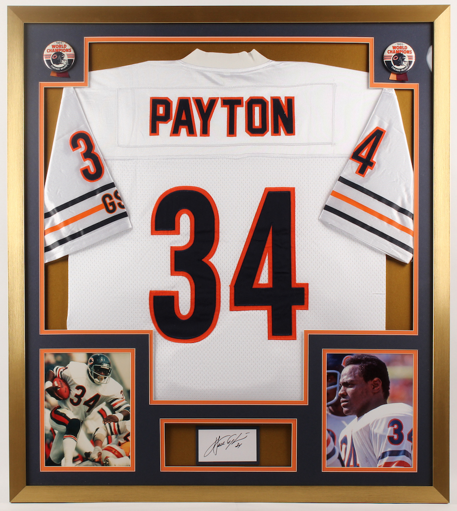 Custom frame measures 32" x 36" in size and has been hand-signed in black felt-tip pen by Walter Payton (D. 1999, Chicago Bears, HOF).