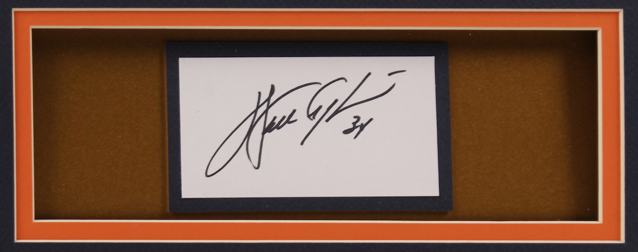 The autographed index card was authenticated and encapsulated by PSA/DNA for authenticity purposes. Index card has been removed from the slab and placed into a framed display.