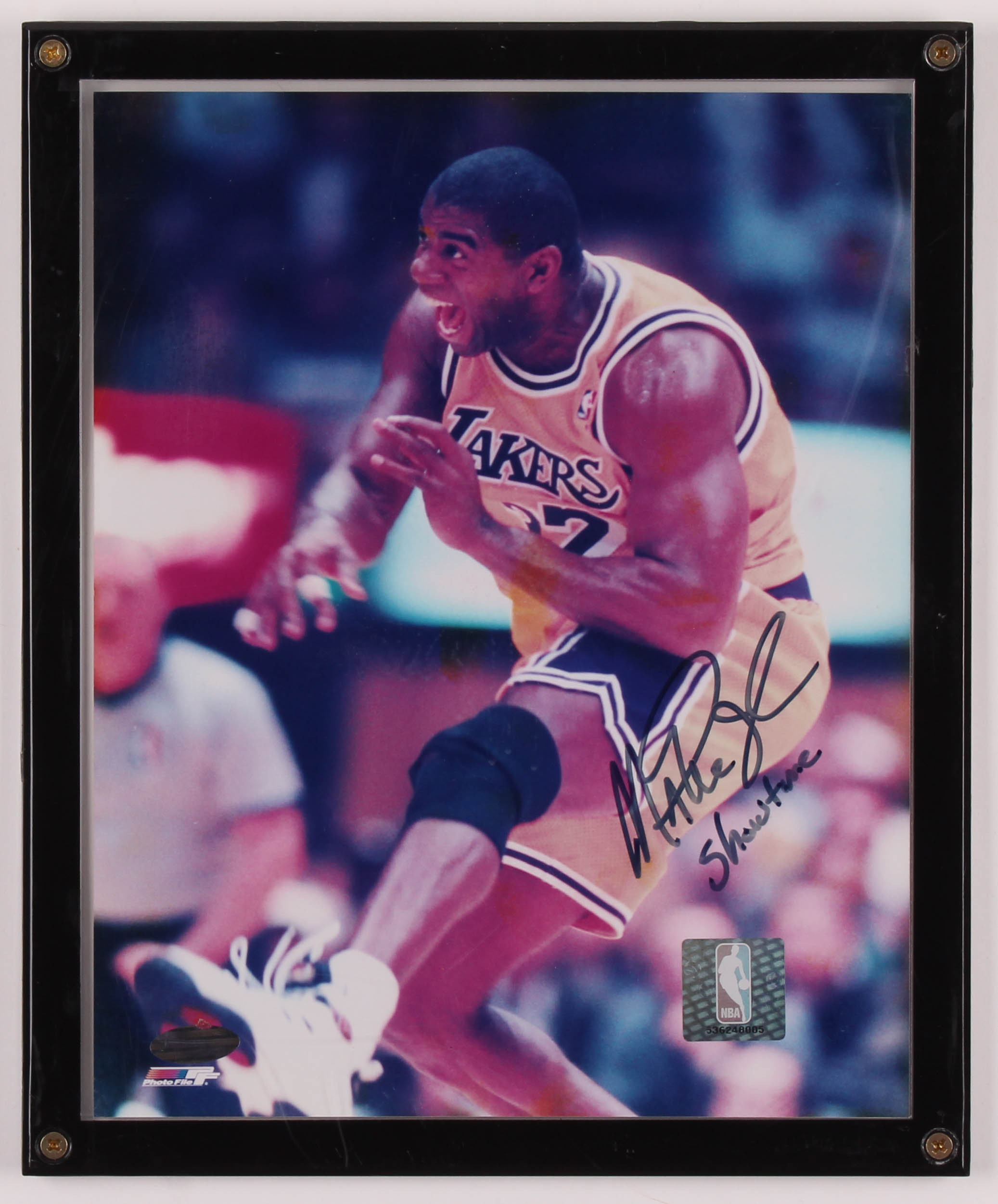 Custom plaque display measures approximately 9" x 11" in size. Hand-signed in black felt-tip pen by Magic Johnson (Los Angeles Lakers, HOF).