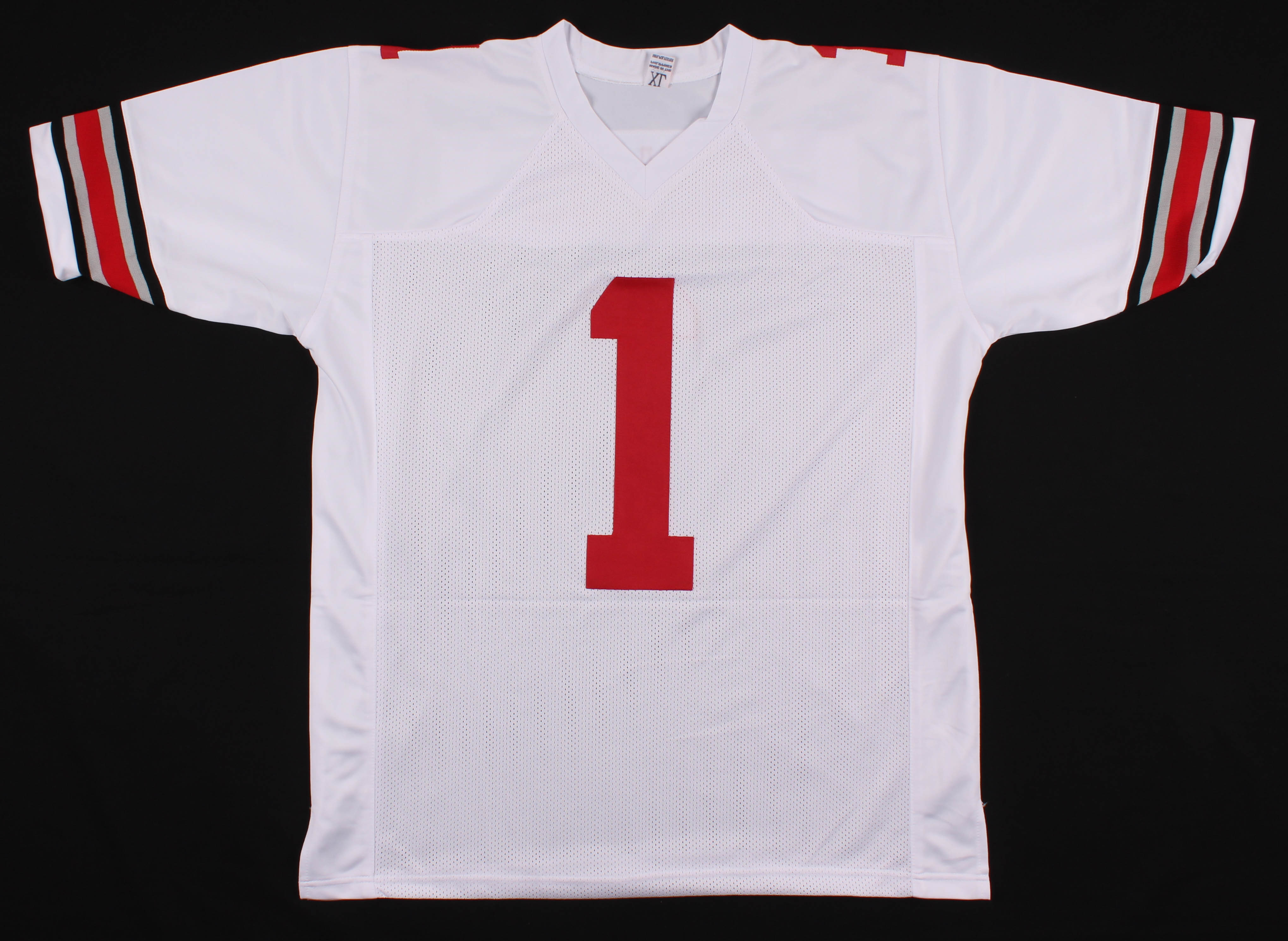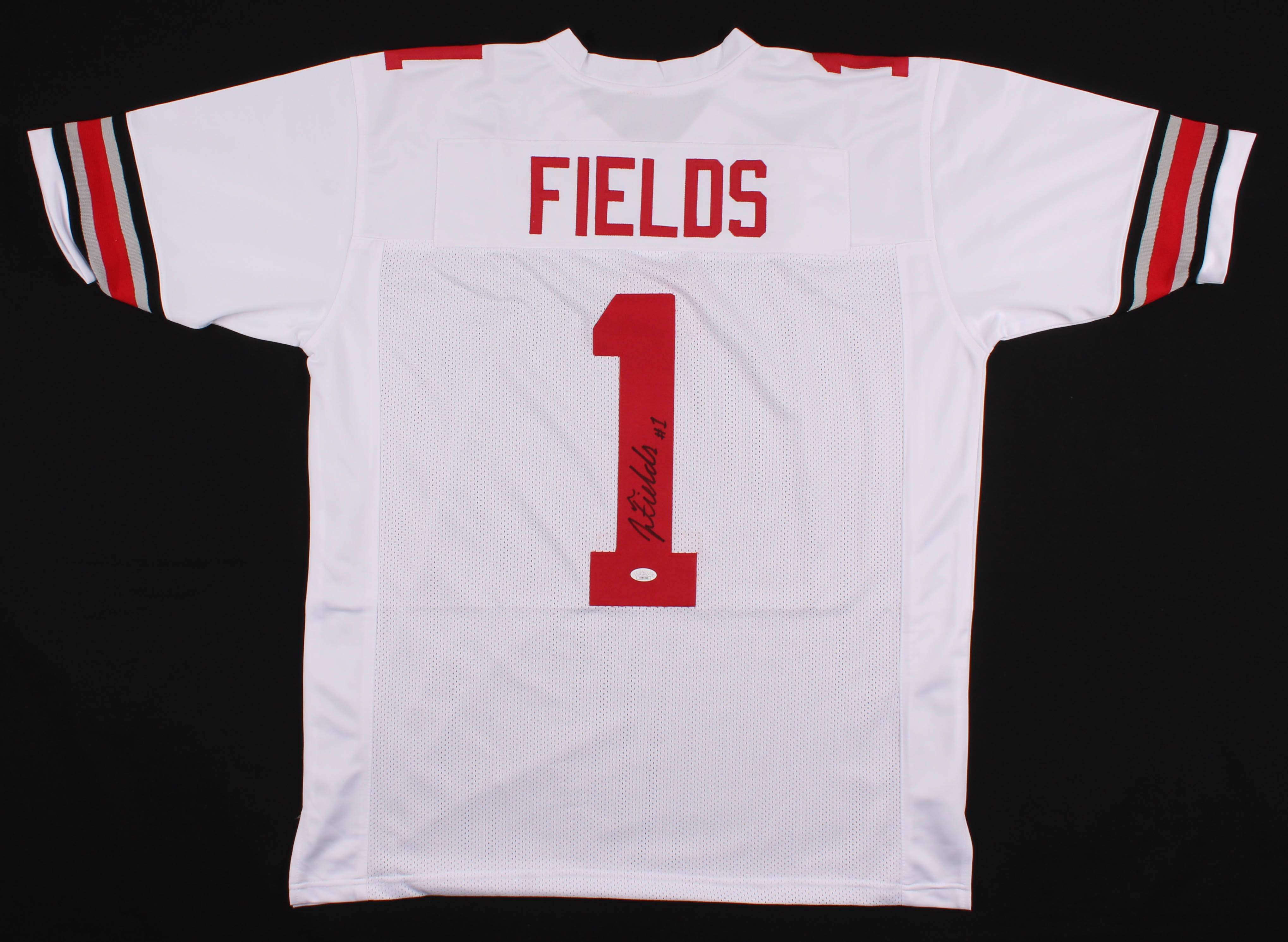 Custom on-field style jersey. Everything is sewn on, size XL. Hand-signed in black felt-tip pen by Justin Fields.