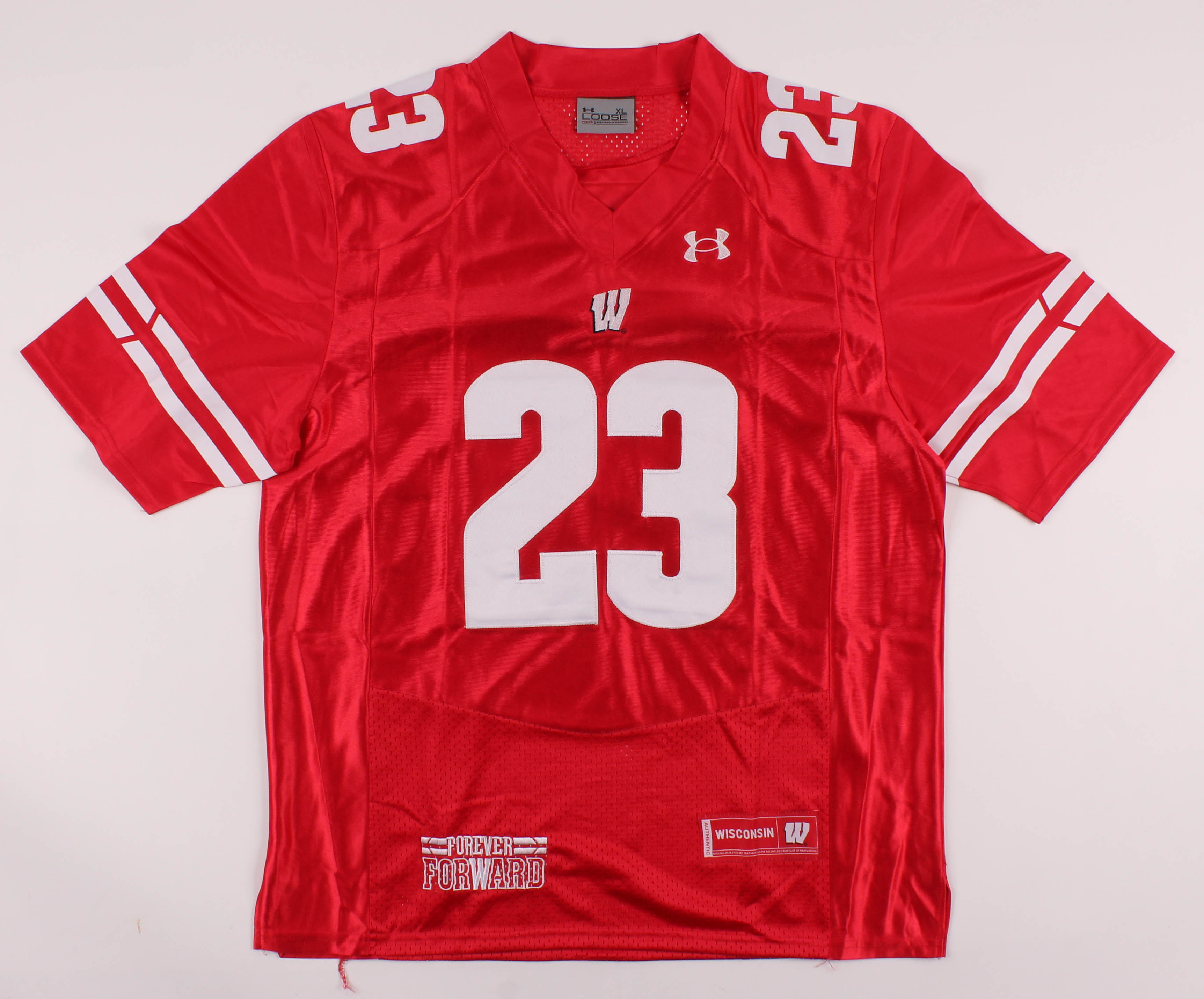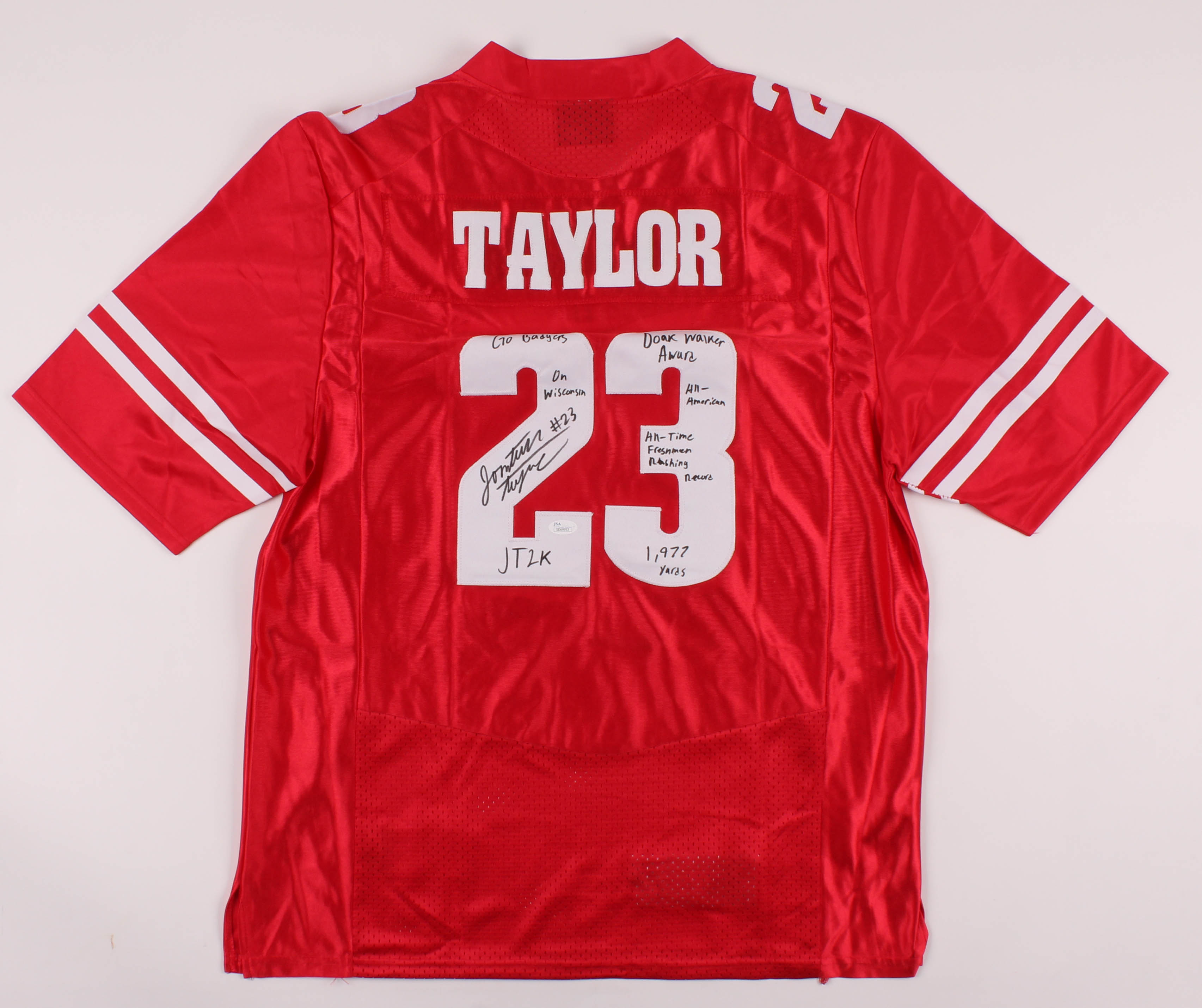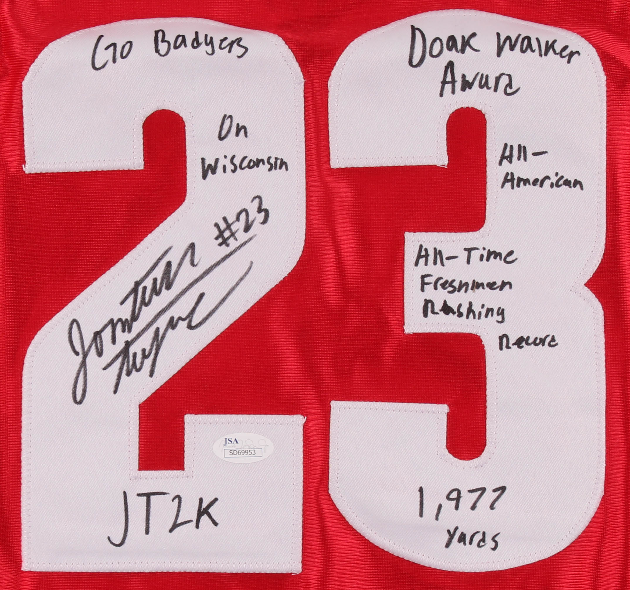 Under Armor on-field style jersey. Everything is sewn on, size XL. Hand-signed and inscribed in black felt-tip pen by Jonathan Taylor. Inscriptions read "Go Badgers", "On Wisconsin", "JT2K", "Doak Walker Award", All-American", "All-Time Freshman Rushing Record" and "1,977 Yards".