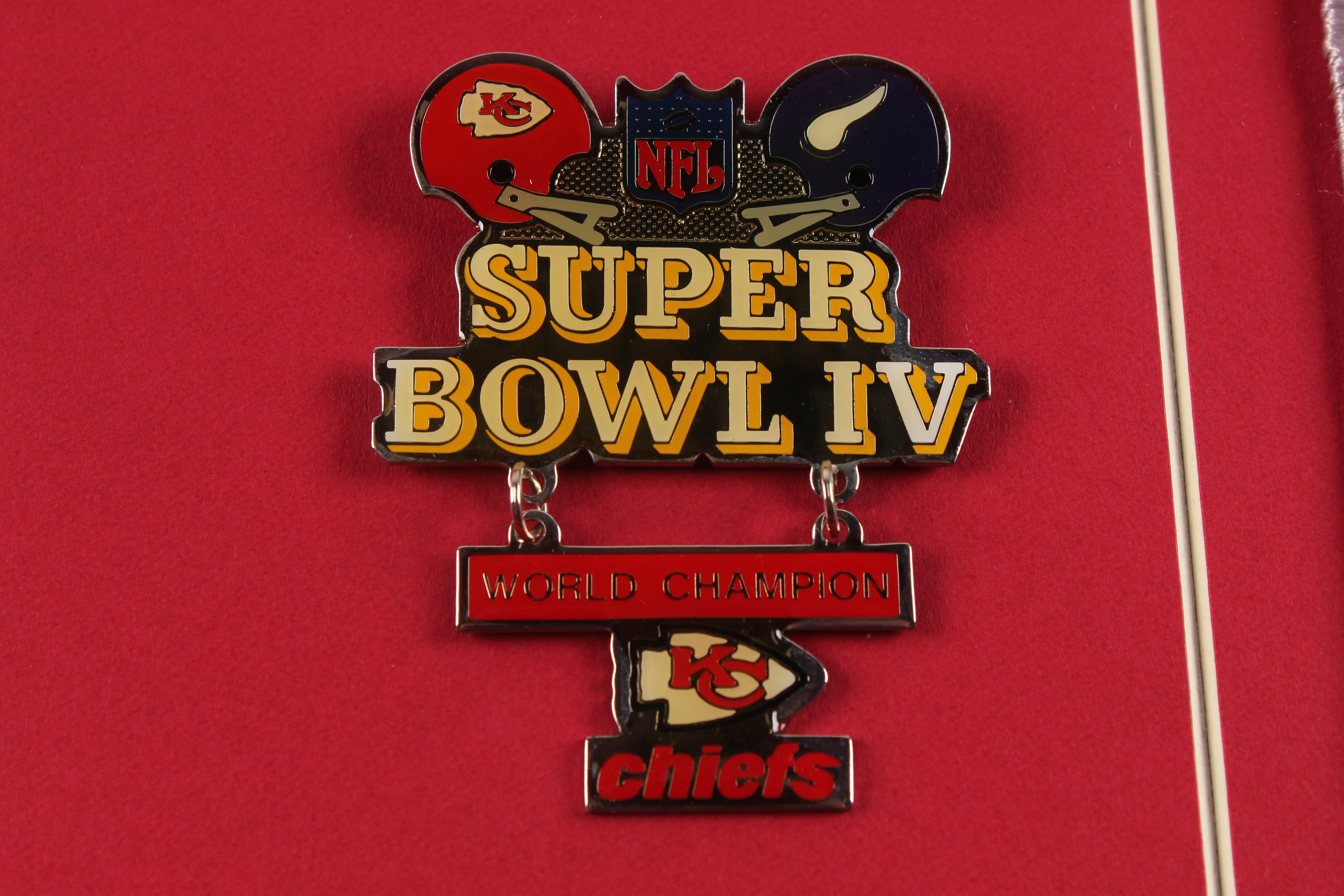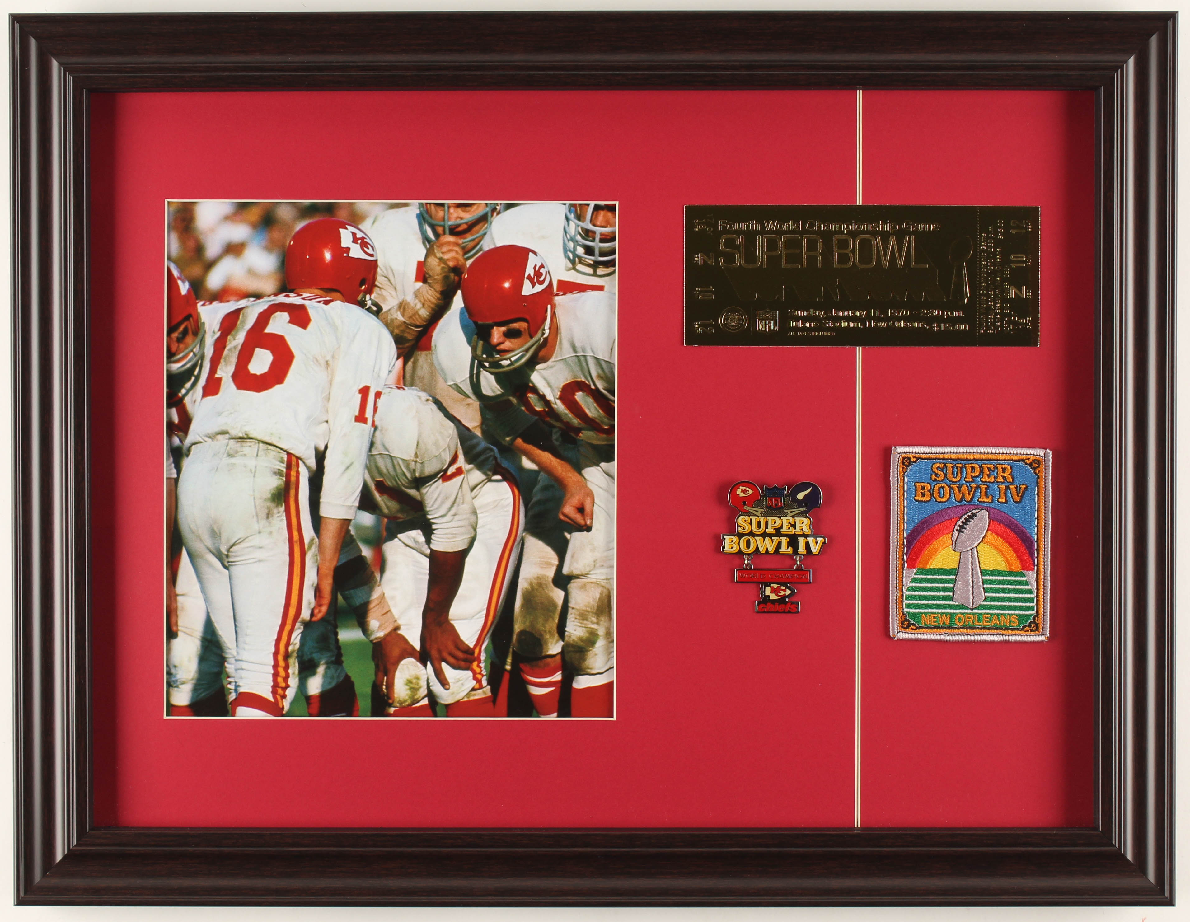 Custom frame measures 16.5" x 21.5" in size and features a photo from Super Bowl IV. Display also features a 23 KT gold replica ticket, Super Bowl IV patch and pin.