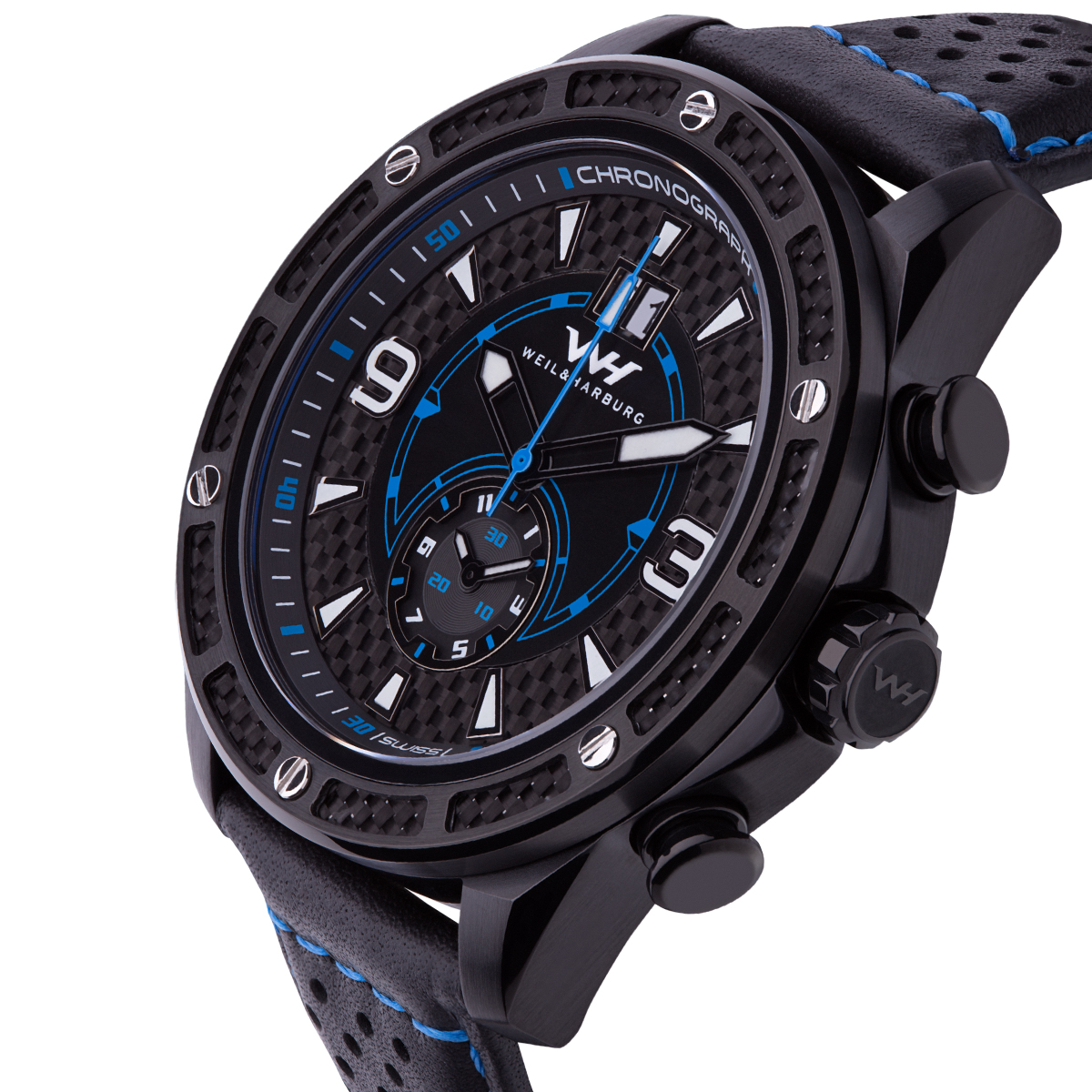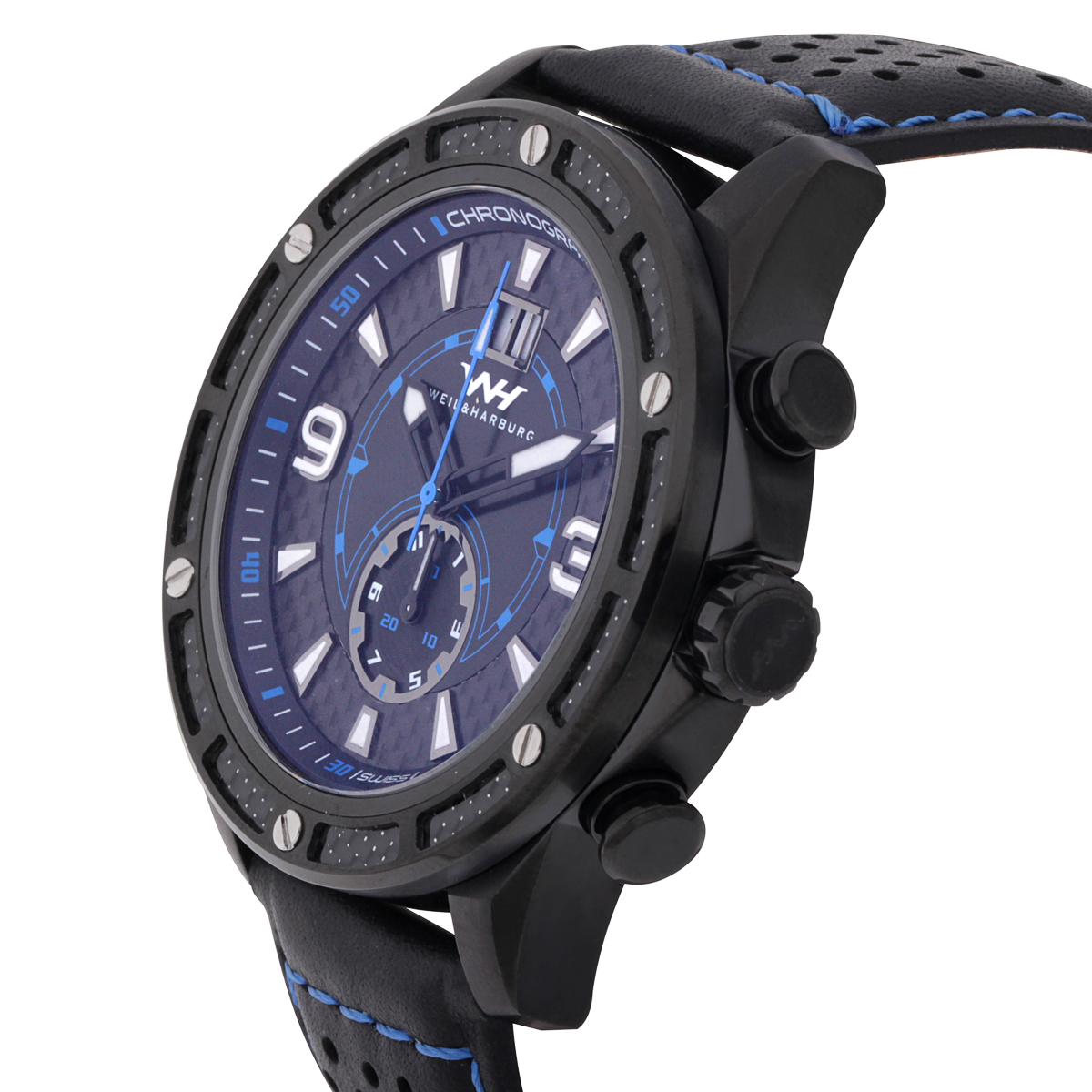 The Weil & Harburg Murdoch Men's Swiss Chronograph Watch features a black leather strap, blue stitching, and black dial. Please see photos for details.