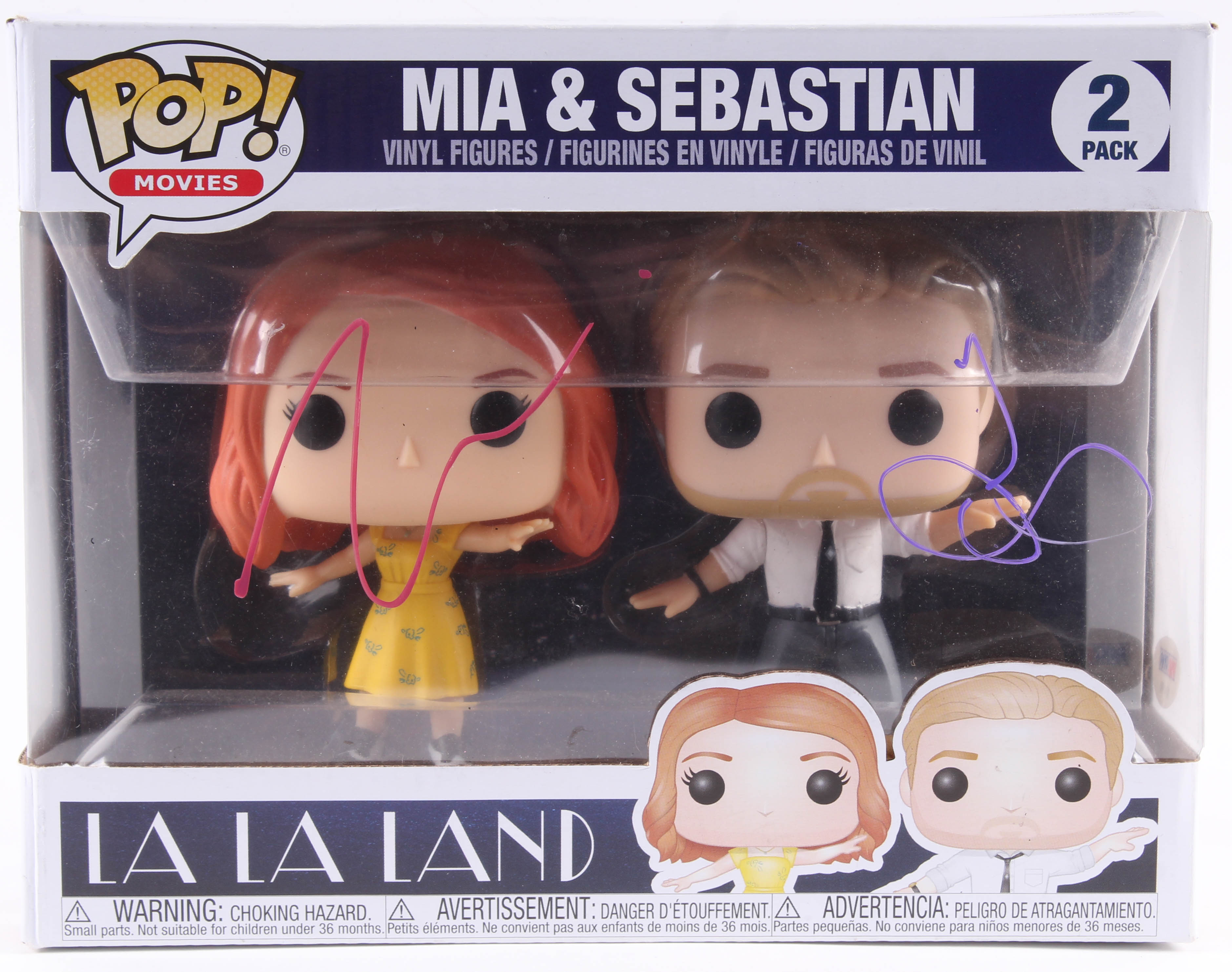 Funko Pop Vinyl Figures measures approximately 4" and hand-signed in pink and purple paint pen on the packaging by Ryan Gosling (Sebastian Wilder) and Emma Stone (Mia Dolan).