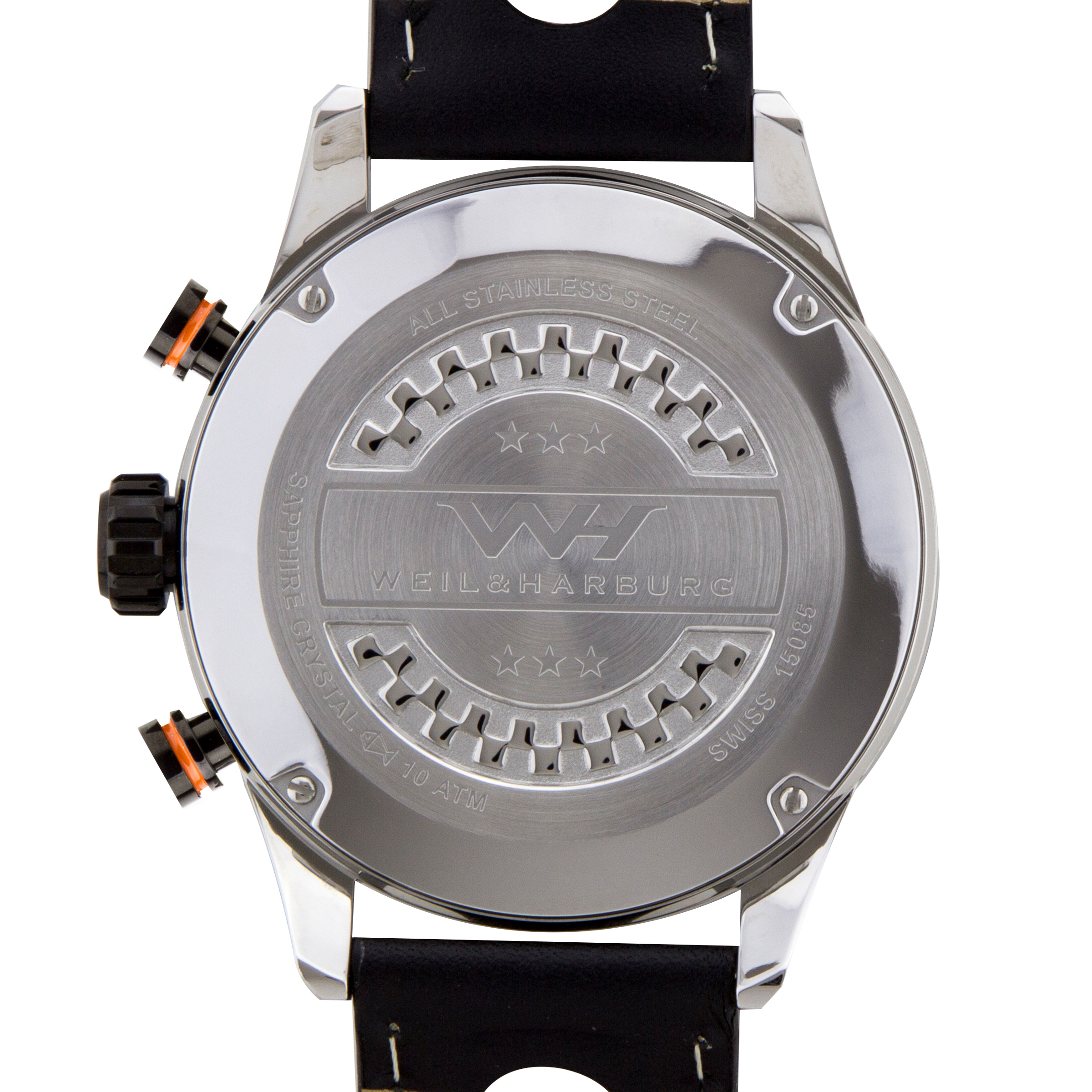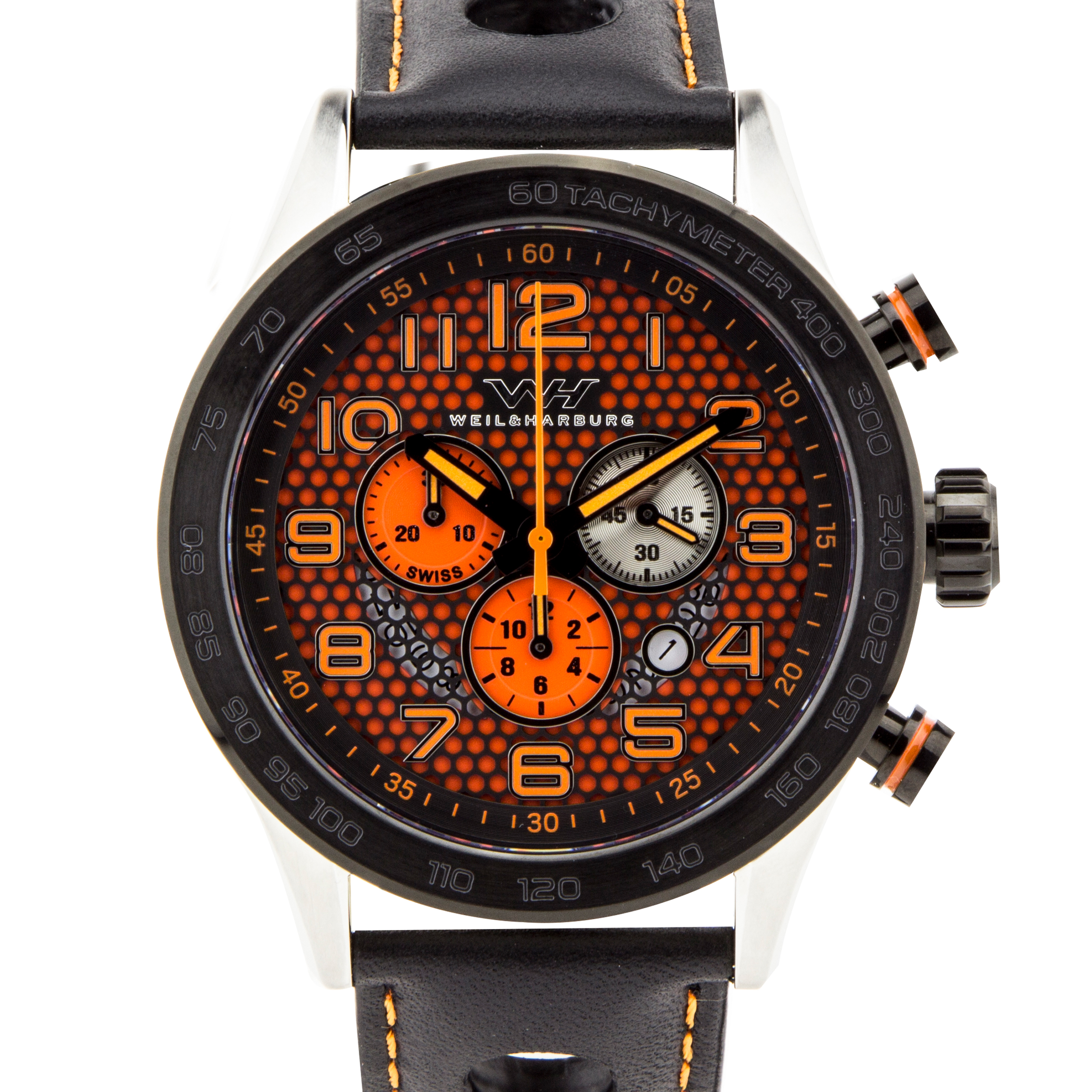 The Weil & Harburg Omnix Men's Chronograph Watch features a black leather strap, orange-and-black dial, silver case, and black bezel. Please see photos for details.