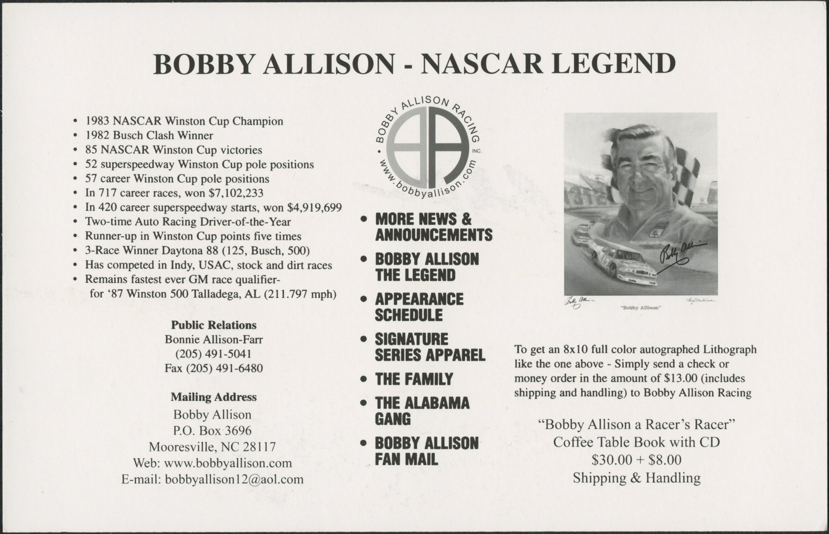 Print measures approximately 5" x 8" in size and has been hand-signed in black felt-tip pen by Bobby Allison (HOF). Please see images for details regarding the condition of the print.