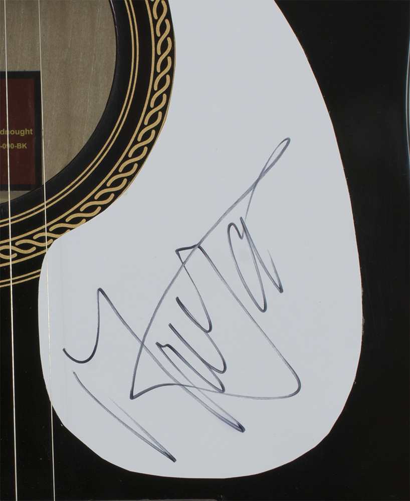 Rogue full-size acoustic guitar. Hand-signed in black felt-tip pen by Mick Jagger.