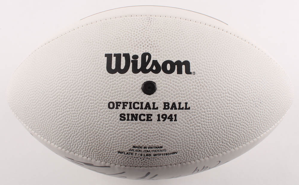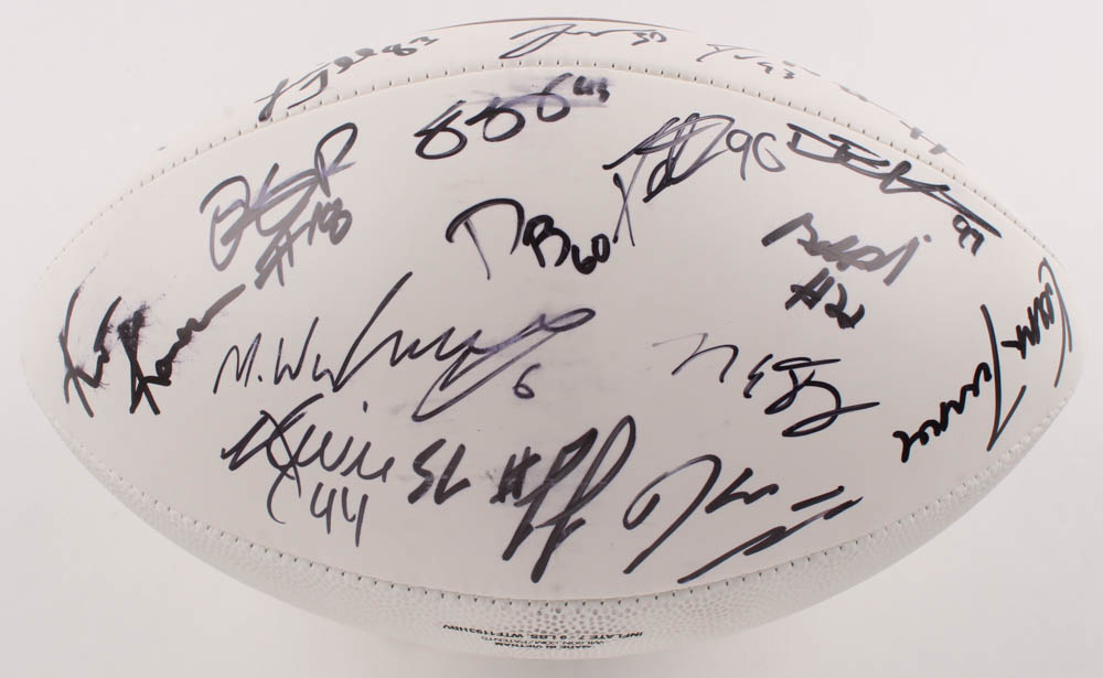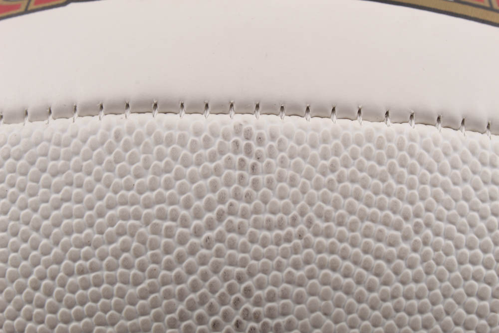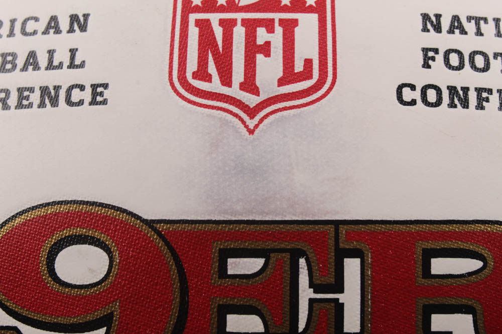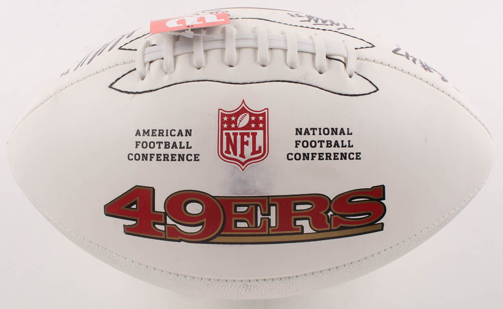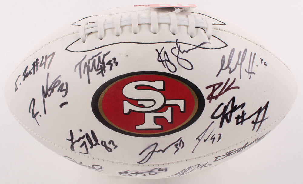 San Francisco 49ers Logo Football has been hand-signed in black felt-tip pen by (23) with Kyle Shanahan, Raheem Mostert, DeForest Duckner, Matt Breida, Kyle Juszczyk, Jeff Wilson, Dante Pettis, Marcell Harris, Ross Dwelley, Mitch Wishnowsky, Laken Tomlinson, Keena Turner, Tarvarius Moore, Julian Taylor, Daniel Brunskill, Robert Saleh, Levine Toilolo, Elijah Lee, D.J. Jones, Damonte Moore, and (2) others. Please note the football has minor staining.